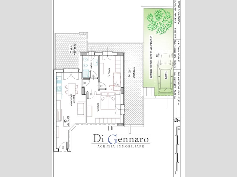 Internamente gli spazi sono così organizzati: ingresso su zona giorno con angolo cottura, disimpegno, una camera da letto matrimoniale, una camera doppia ed un bagno. Punto forte sono sicuramente gli esterni: collegato alla zona giorno un bellissimo terrazzo coperto di 13 mq, un secondo terrazzo di 25 mq nella zona notte e un giardino privato di 70mq con annessa area per il parcheggio dell'auto. Esposizione nord ovest.