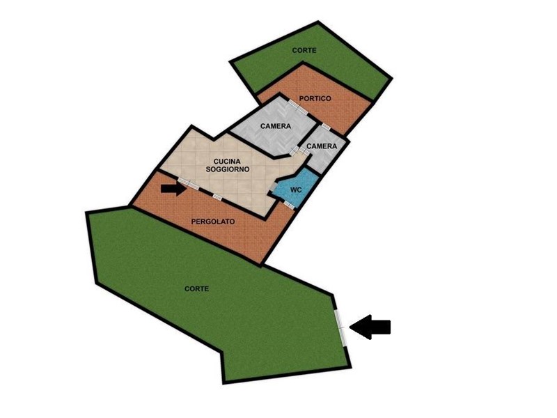 L'immobile, parzialmente arredato, si sviluppa su una superficie di mq 75 così suddivisa: ingresso da ampio pergolato su cucina/soggiorno, camera da letto matrimoniale con accesso a uno spazioso porticato, cameretta e wc con doccia; internamente si presenta in ottimo stato con pavimentazione in cotto, infissi in legno e vetrocamera, riscaldamento autonomo e pompe di calore.