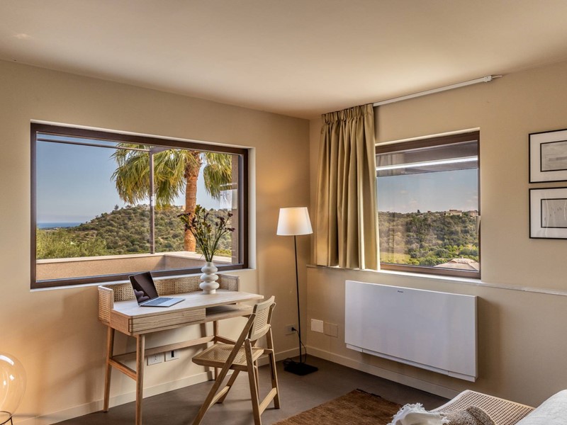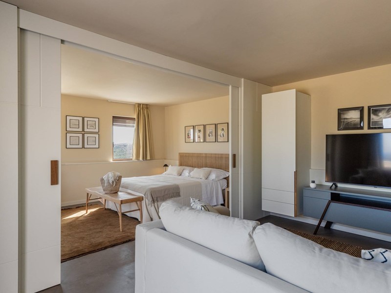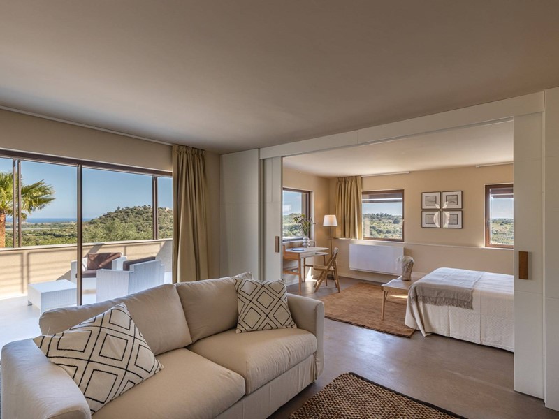 Questo esclusivo spazio privato, con vista mozzafiato, è composto da una spaziosa camera da letto, con angolo scrivania e una parete in legno scorrevole che la divide da un secondo ambiente con zona salotto e possibilità di utilizzo del comodo divano letto matrimoniale. I grandi spazi, il bagno privato con doccia e la terrazza privata di 20 mq, da cui poter godere della vista del mare, rendono questa camera una perfetta suite familiare.