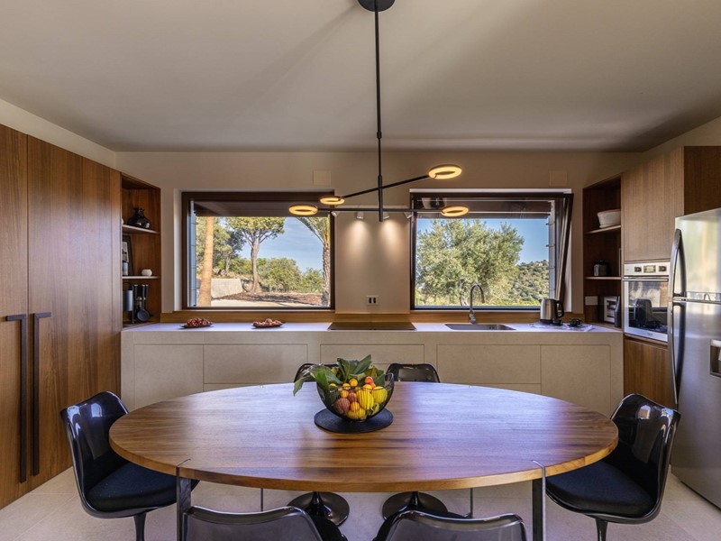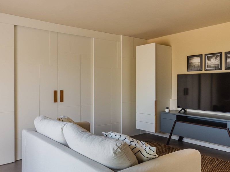 All'interno, uno spazioso salotto con divano e TV, si sposa armoniosamente con una grande cucina dal design moderno completamente accessoriata e una comoda zona pranzo.