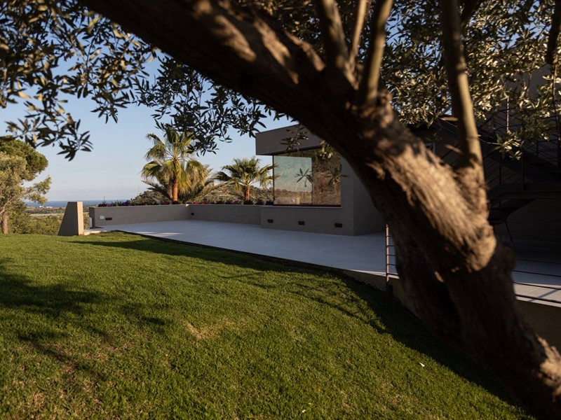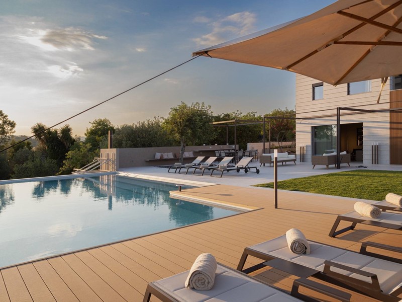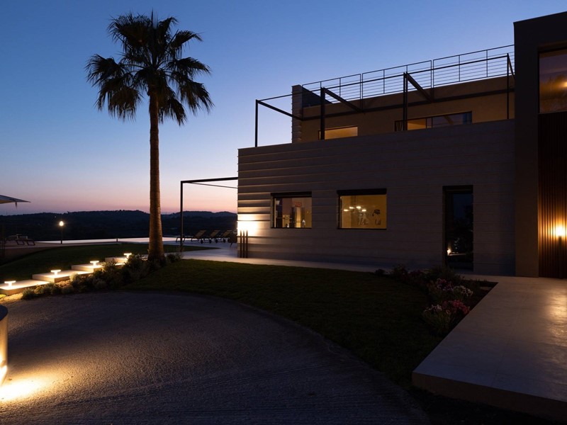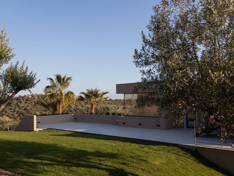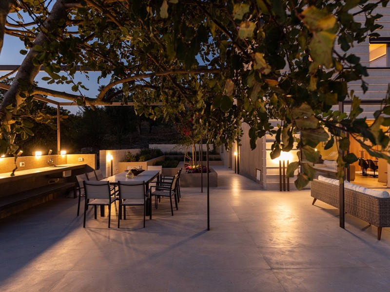 Lo spazio esterno è dotato di una cucina, di una zona con tavolo da pranzo ed una zona salotto esterna. A bordo piscina è situata una zona solarium con lettini prendisole. È inoltre presente un orto ricco di piante aromatiche e verdure e ortaggi di stagione.