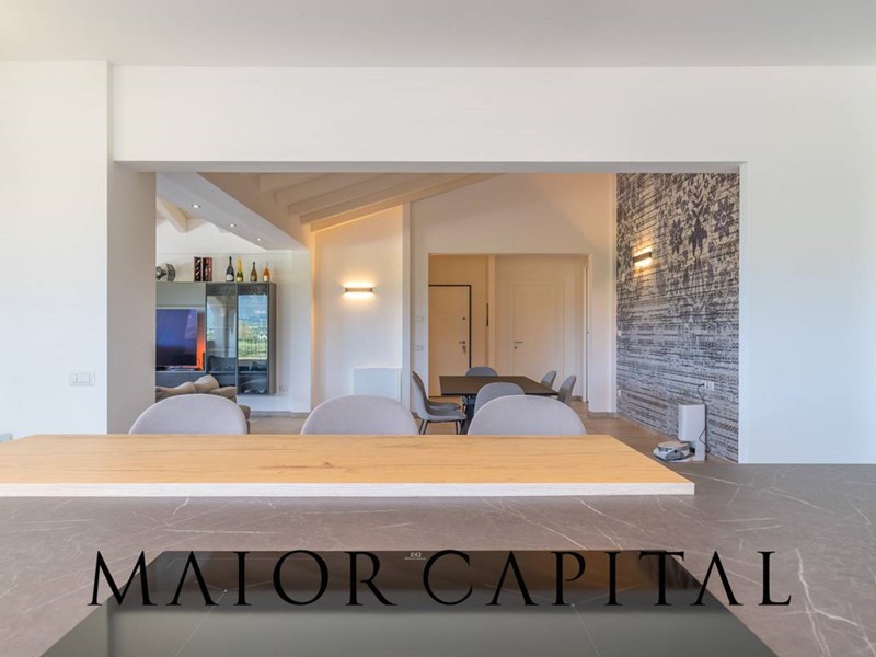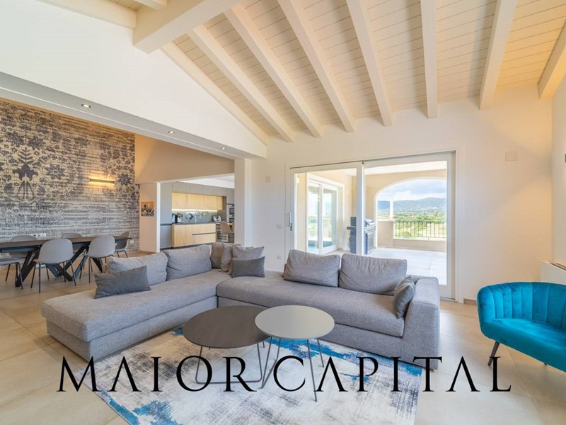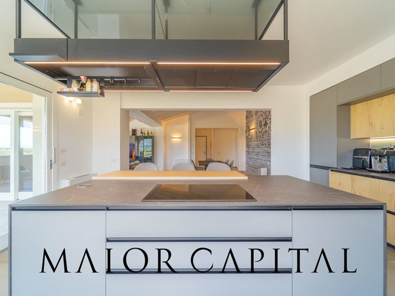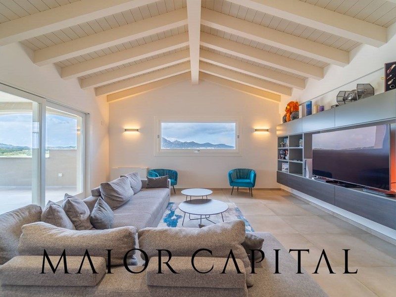 L'ampio living è un open space che include una cucina moderna con isola, illuminato naturalmente da ampie vetrate che offrono viste incantevoli sui monti galluresi.