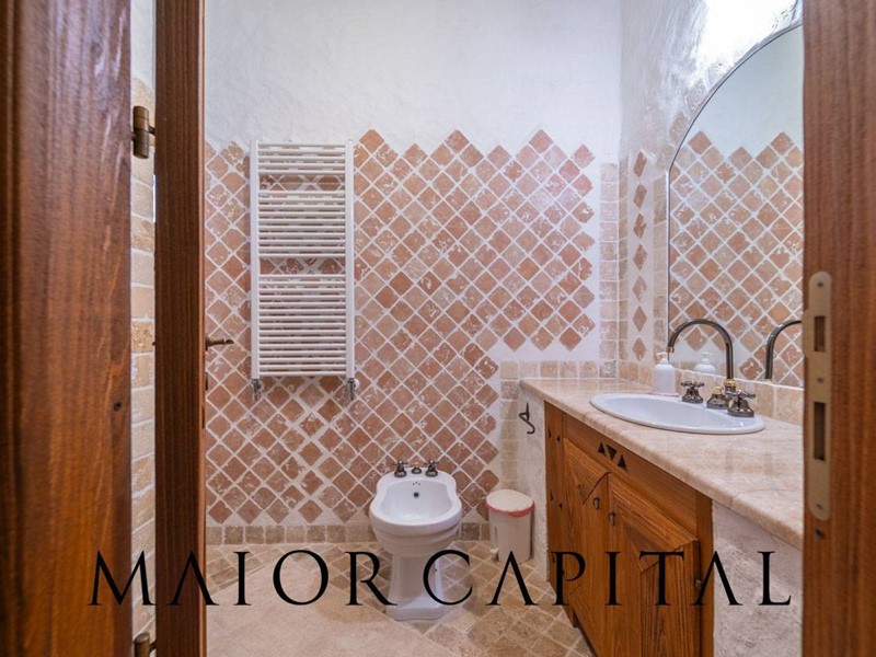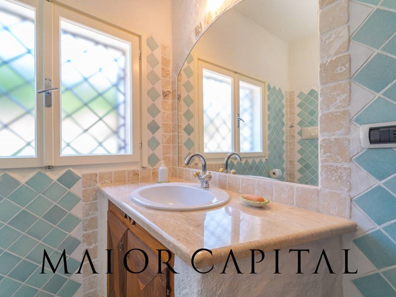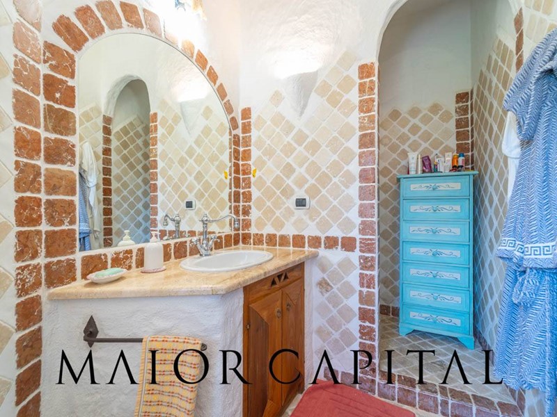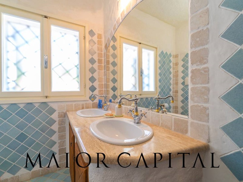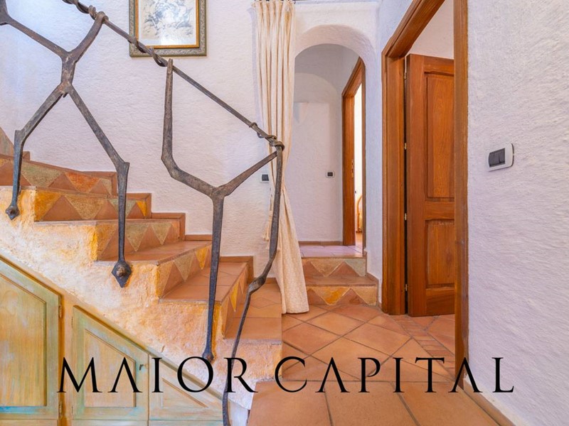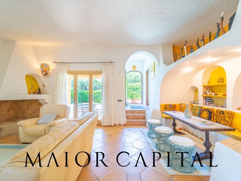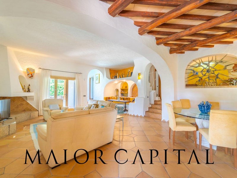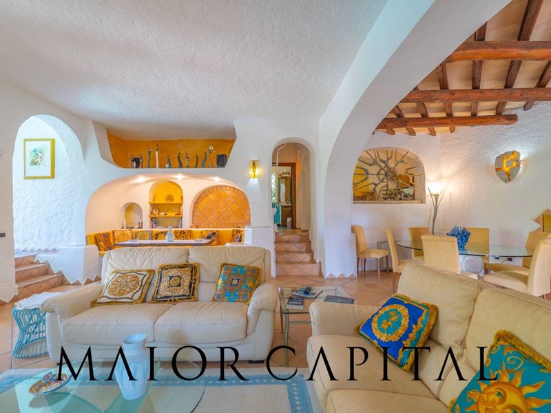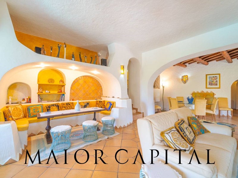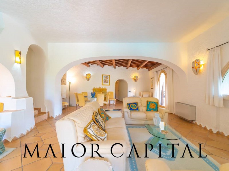 Varcato il cancello d'ingresso, un parco privato curato conduce ai due ingressi principali della villa. Entrambi portano a un grande soggiorno dove l'architettura caratteristica della Costa Smeralda si mostra in tutto il suo splendore. I divani in muratura e le nicchie decorate con dettagli in ferro battuto creano un ambiente caldo e accogliente.