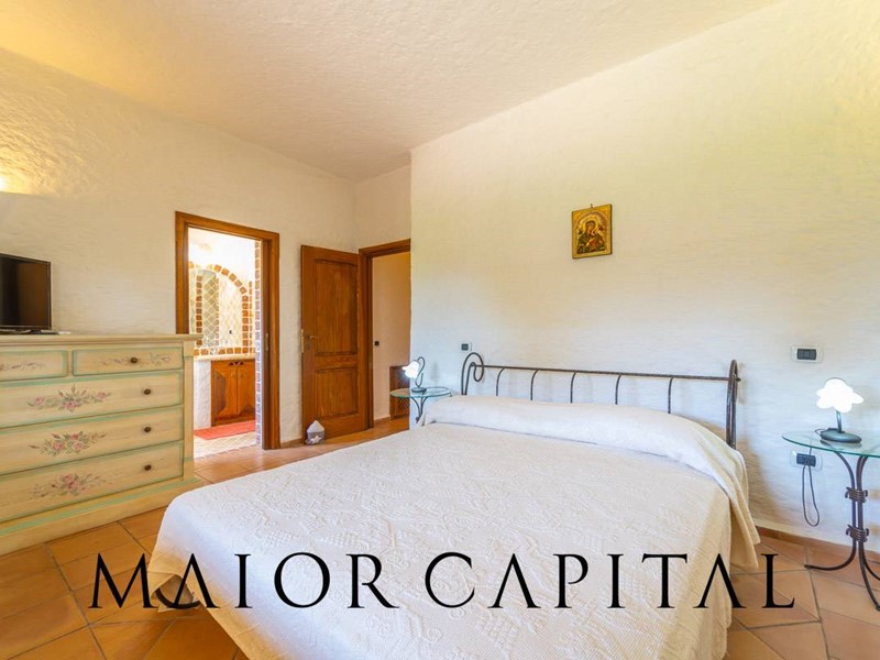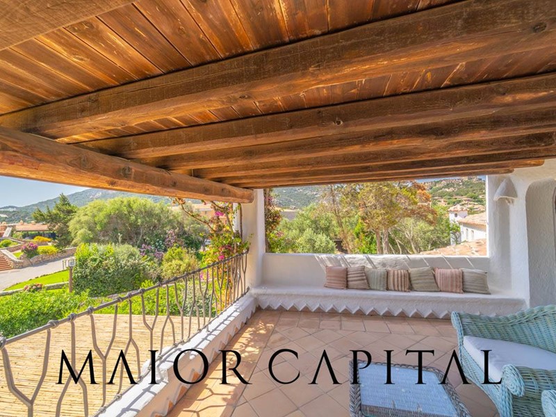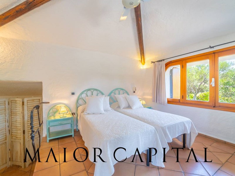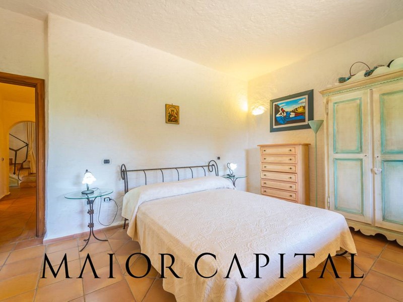 La suite padronale al primo piano offre accesso a una veranda coperta con divano in muratura e accesso a un solarium, perfetto per momenti di relax in totale privacy e dove ammirare la vista sul mare e Porto Cervo.
