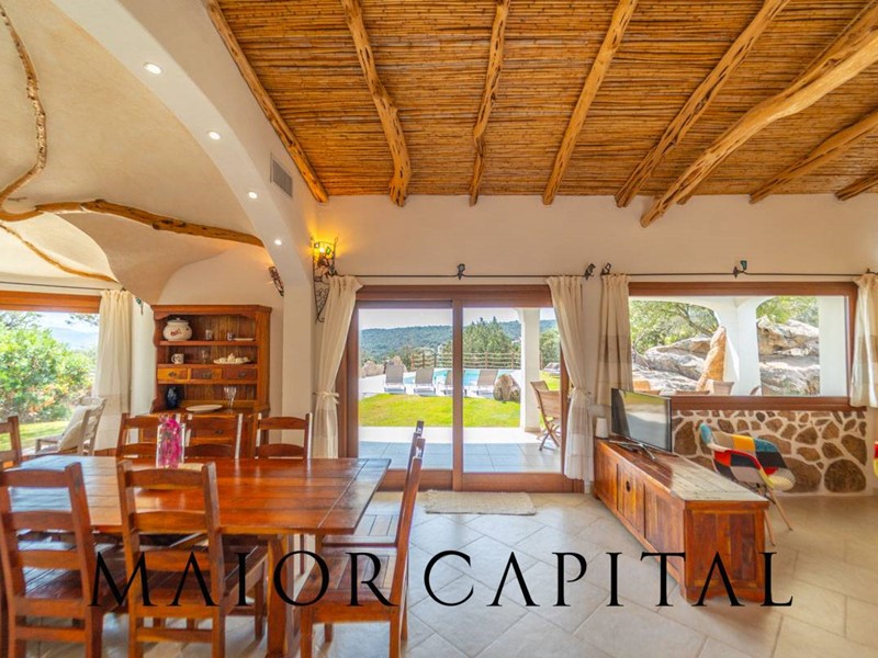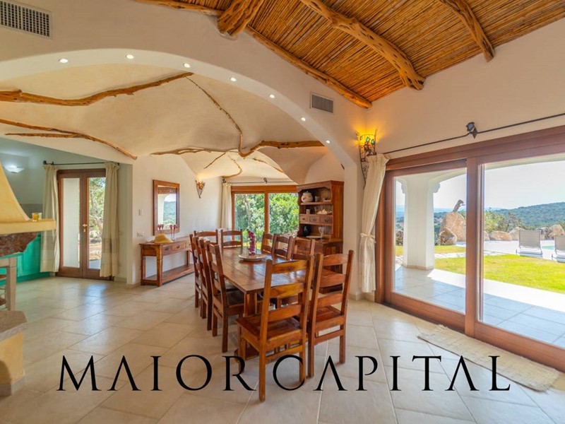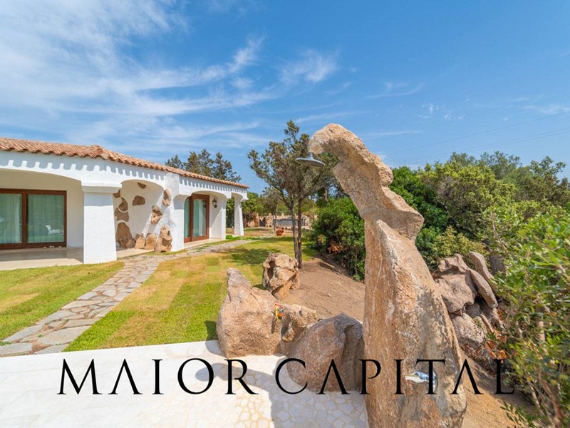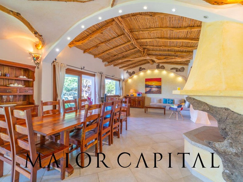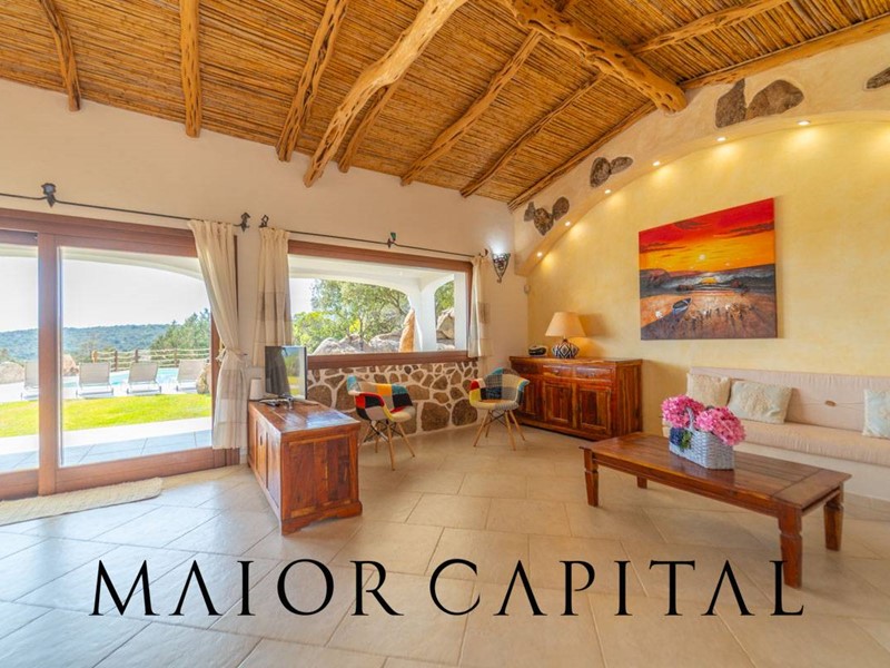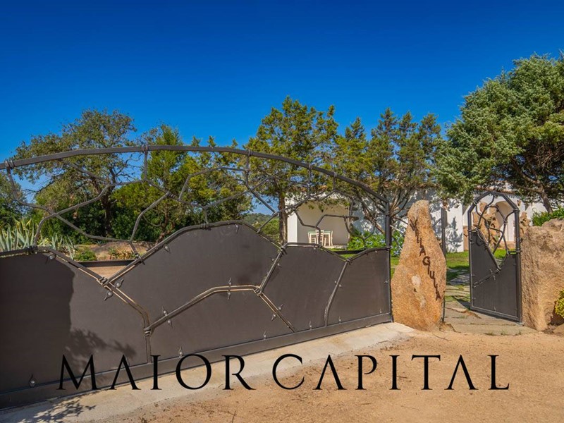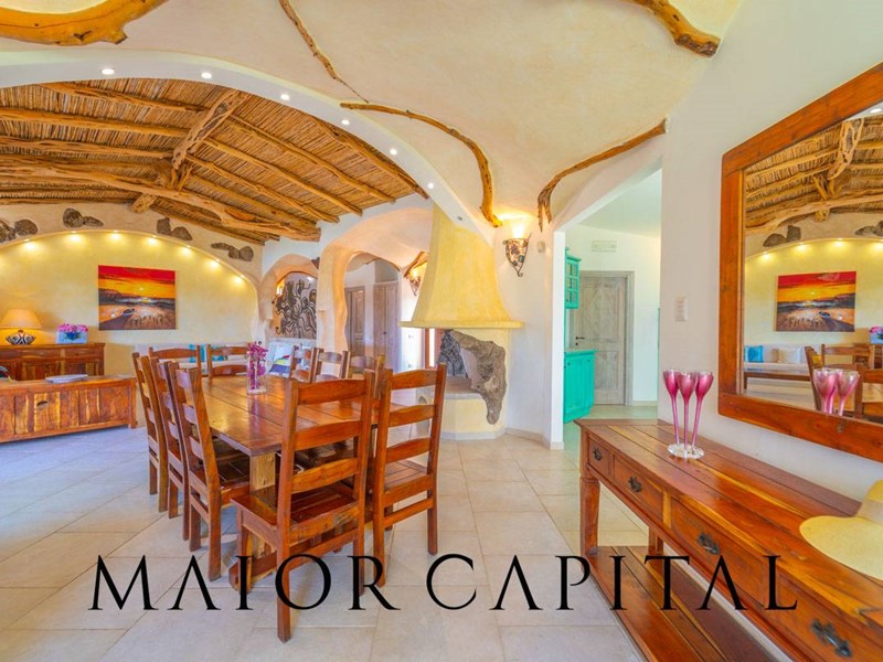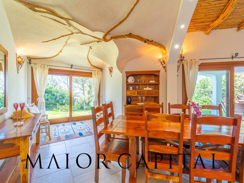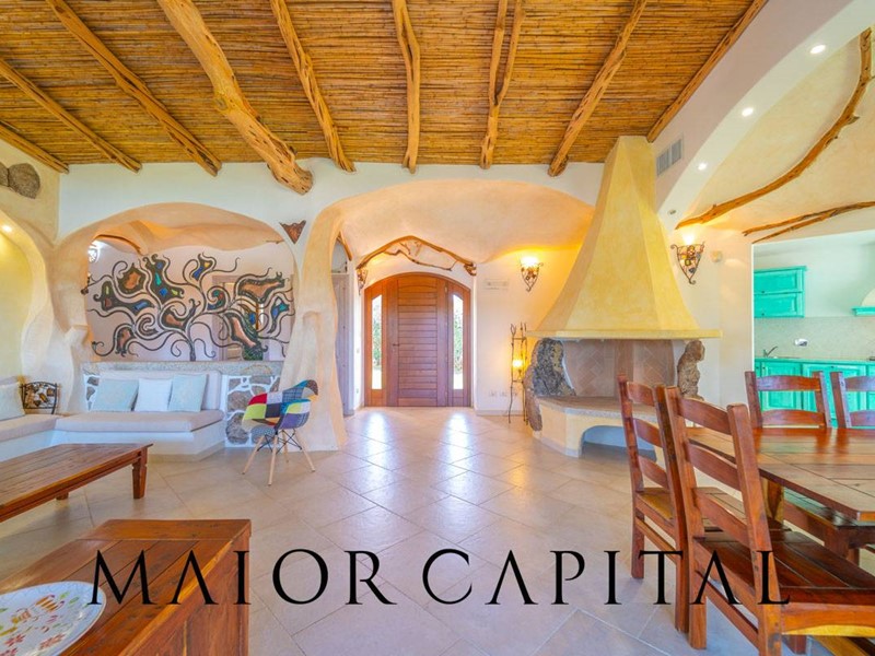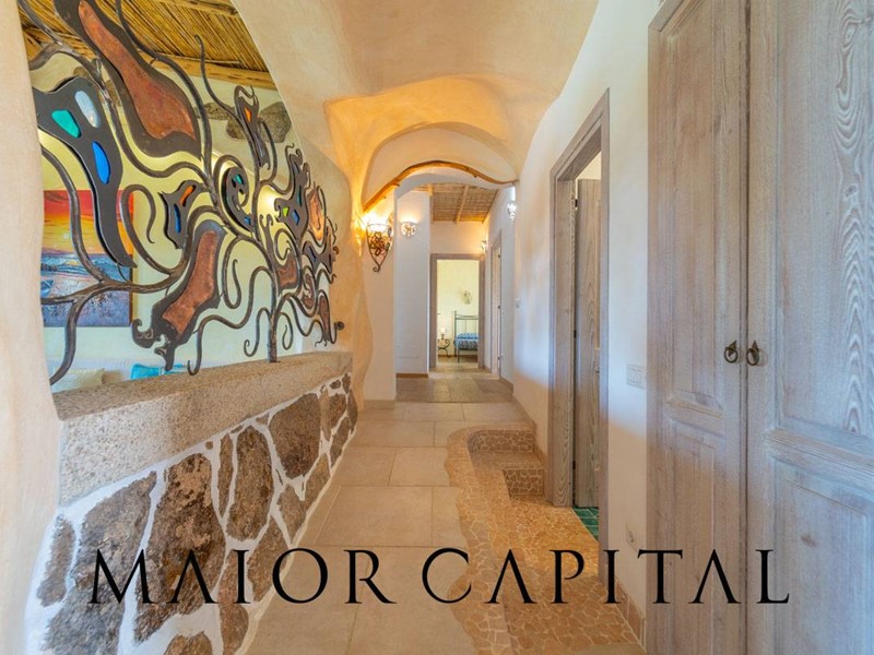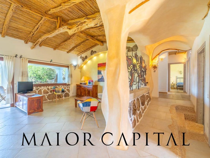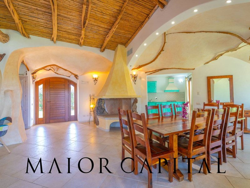 Un elegante viale conduce alla villa, che si distingue per lo stile architettonico sardo, con soffitti in ginepro, rifiniture in ferro battuto, pavimenti in cotto e mobili artigianali realizzati su misura. La zona giorno, ampia e luminosa, si affaccia sul giardino e offre una splendida vista sul verde circostante.