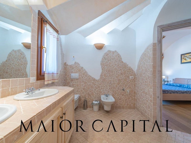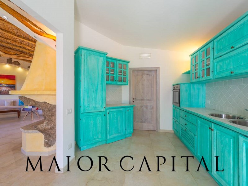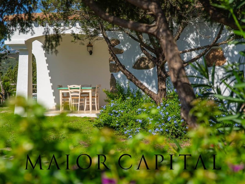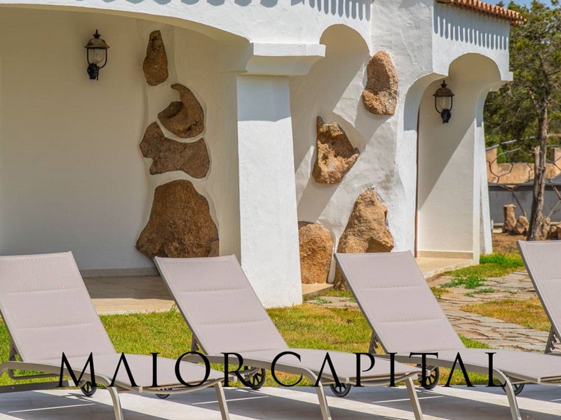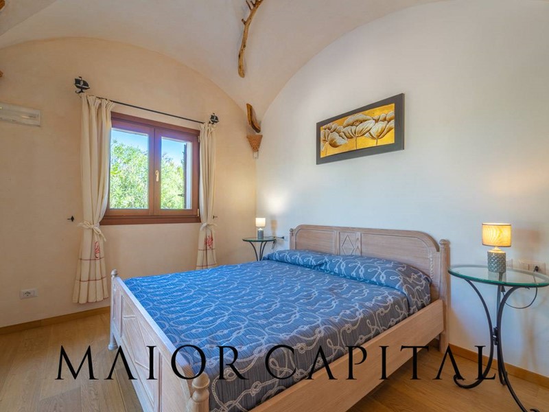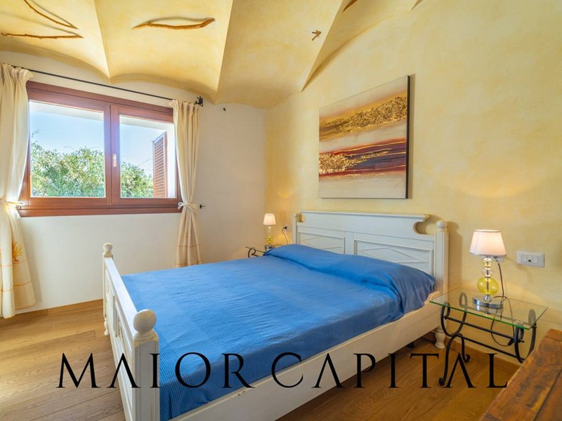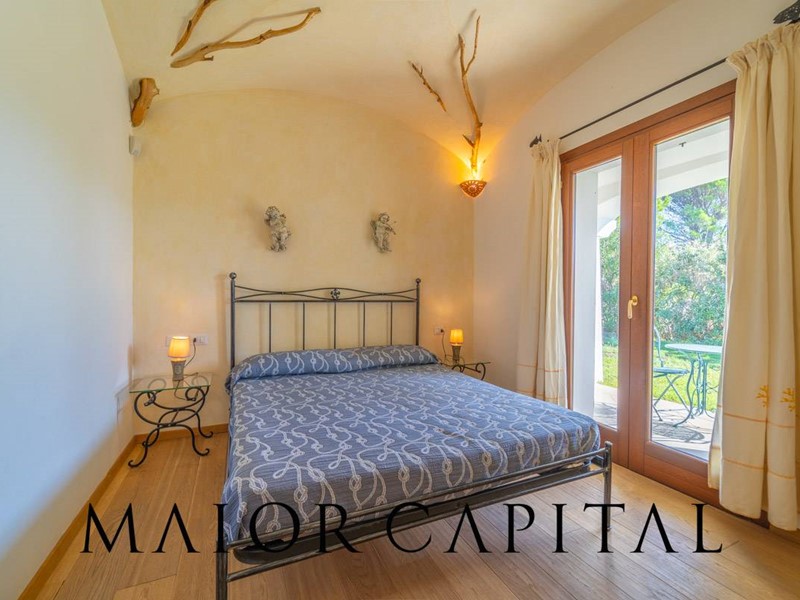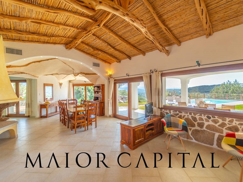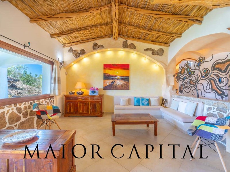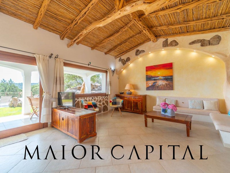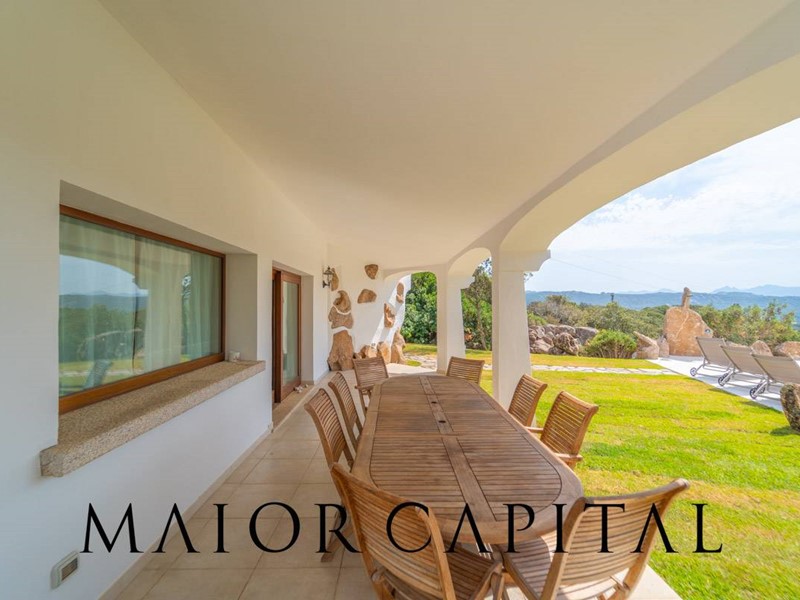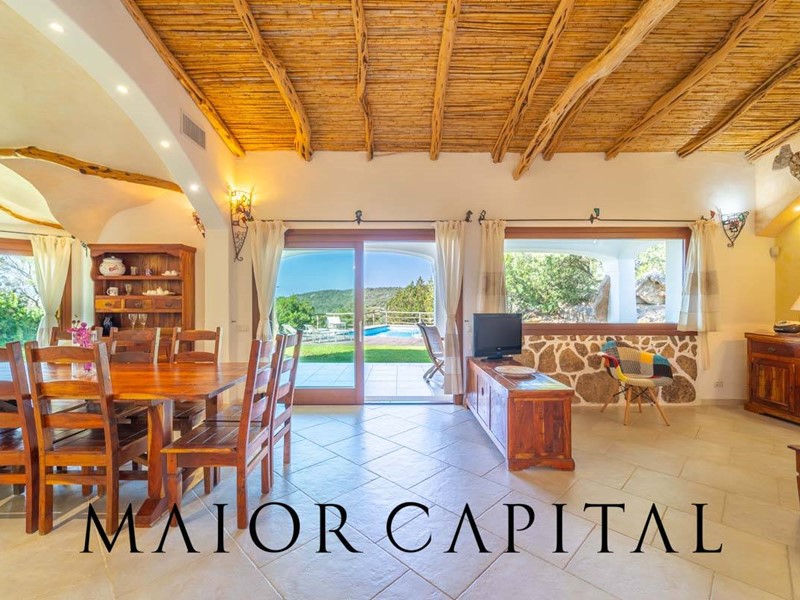 Un elegante viale conduce alla villa, che si distingue per lo stile architettonico sardo, con soffitti in ginepro, rifiniture in ferro battuto, pavimenti in cotto e mobili artigianali realizzati su misura. La zona giorno, ampia e luminosa, si affaccia sul giardino e offre una splendida vista sul verde circostante.