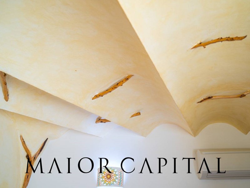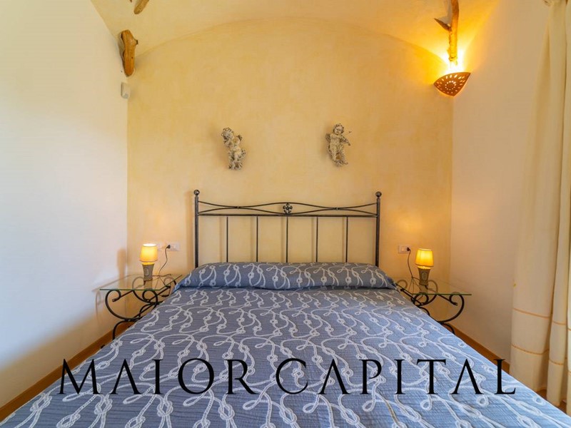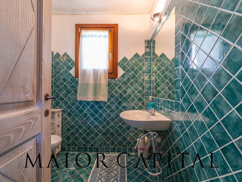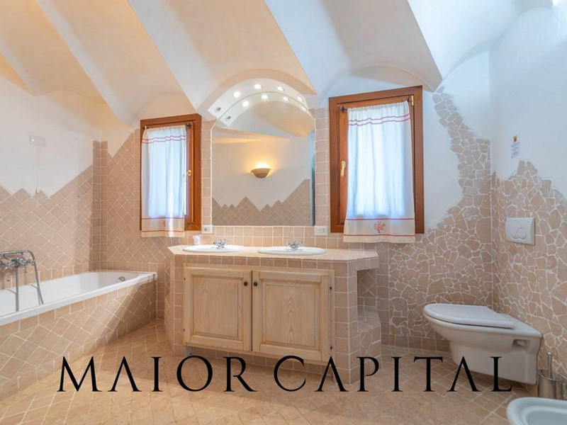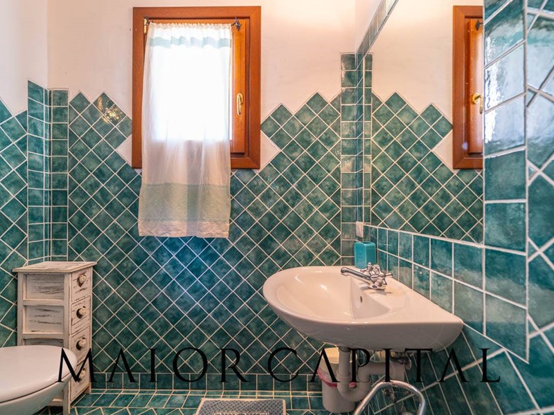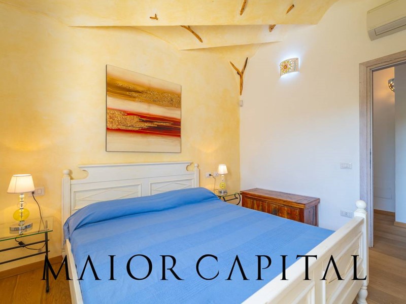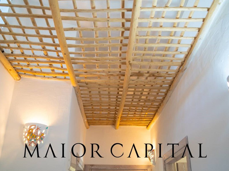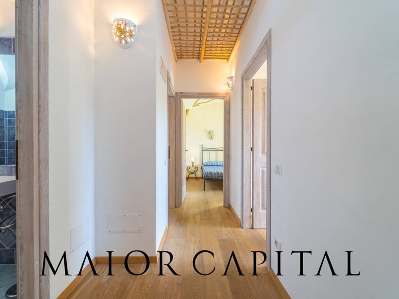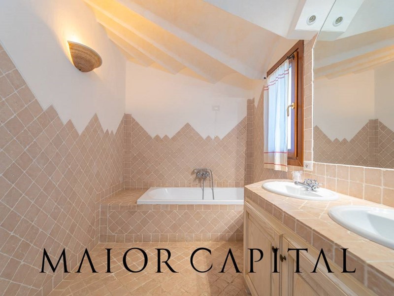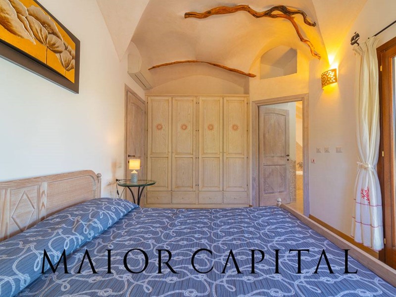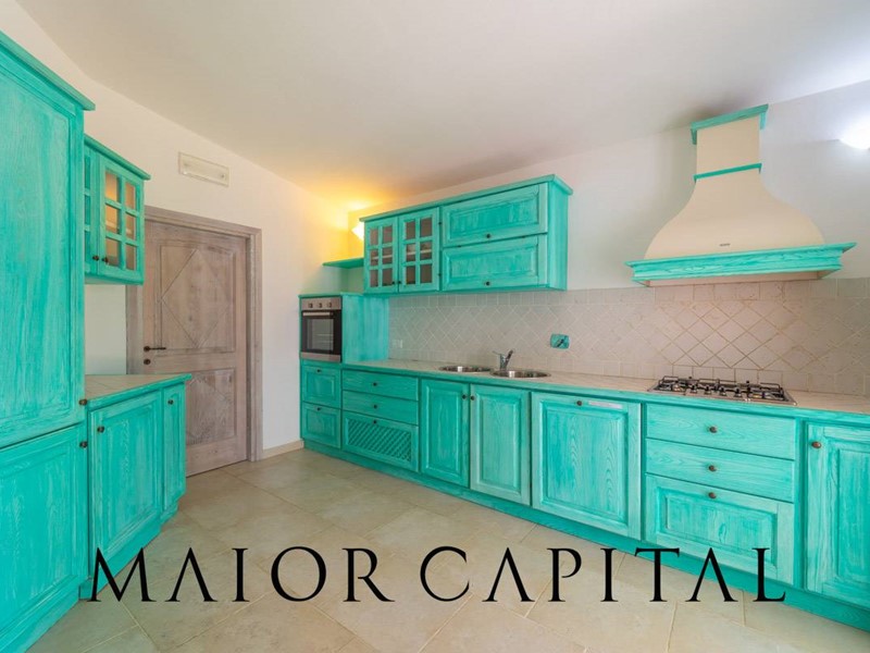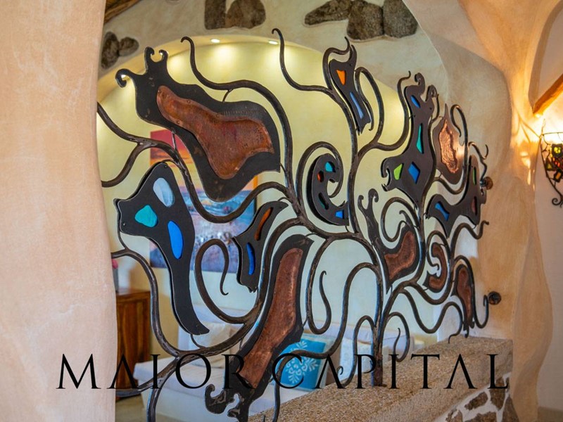 Un elegante viale conduce alla villa, che si distingue per lo stile architettonico sardo, con soffitti in ginepro, rifiniture in ferro battuto, pavimenti in cotto e mobili artigianali realizzati su misura. La zona giorno, ampia e luminosa, si affaccia sul giardino e offre una splendida vista sul verde circostante.