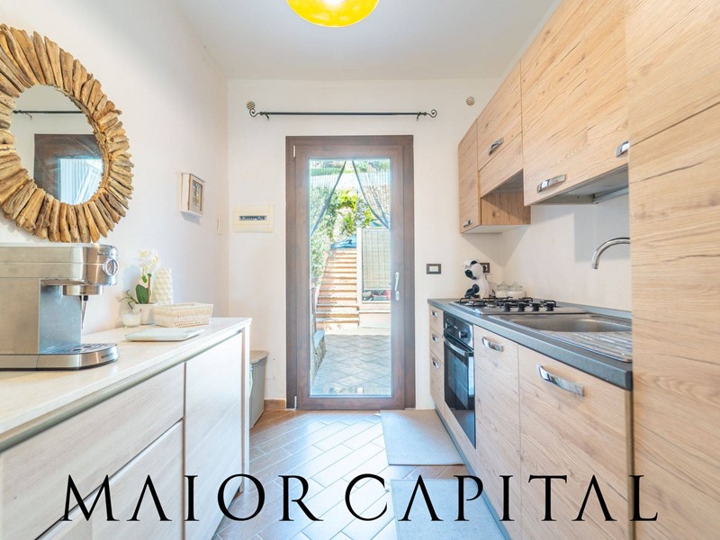 Attraversando la corte privata dingresso si accede al piano terra, composto da un luminoso soggiorno con cucina a vista moderna e funzionale, un bagno con doccia e una veranda coperta attualmente adibita a palestra, facilmente trasformabile in unampia sala da pranzo a vetrate, unaccogliente zona relax o uno studio. Dalla veranda si accede a una seconda corte esterna con doccia esterna comoda per il rientro dal mare o per rinfrescarsi nelle calde giornate estive.