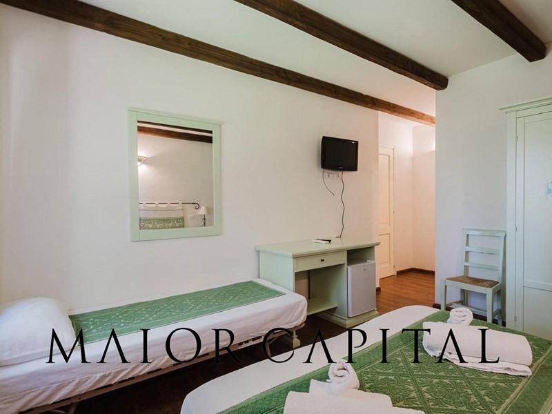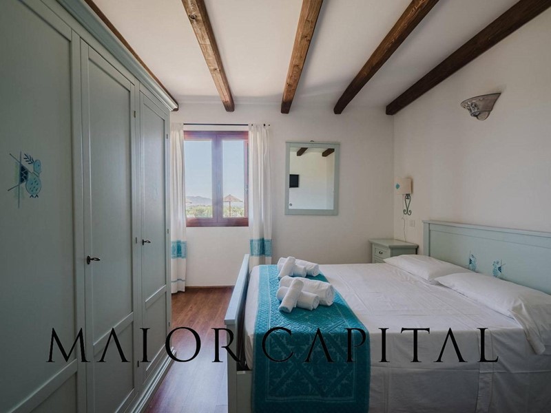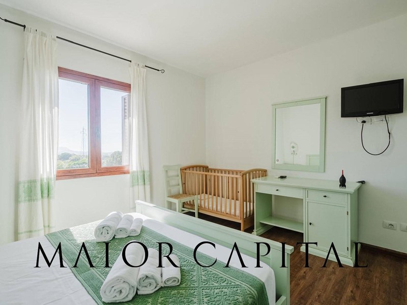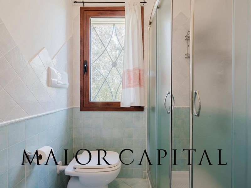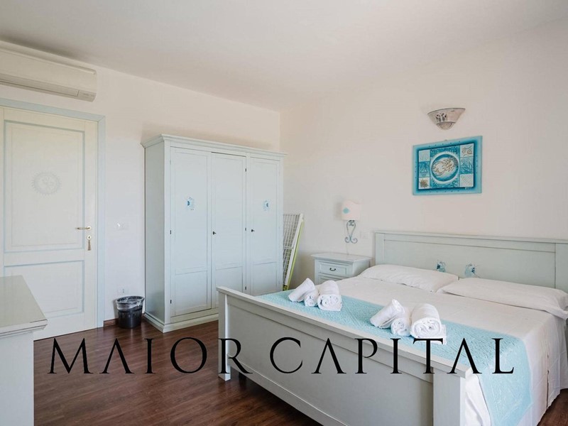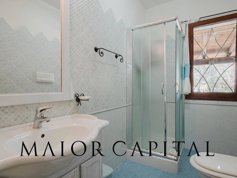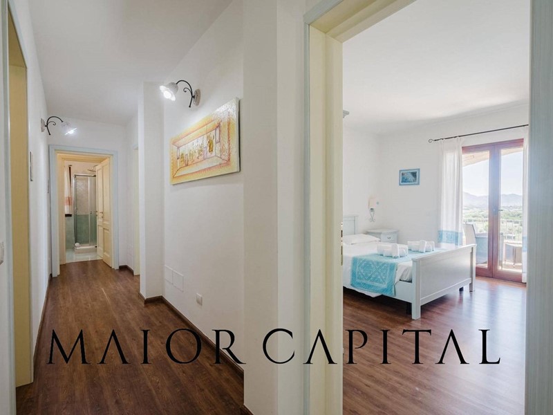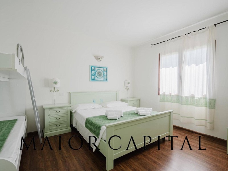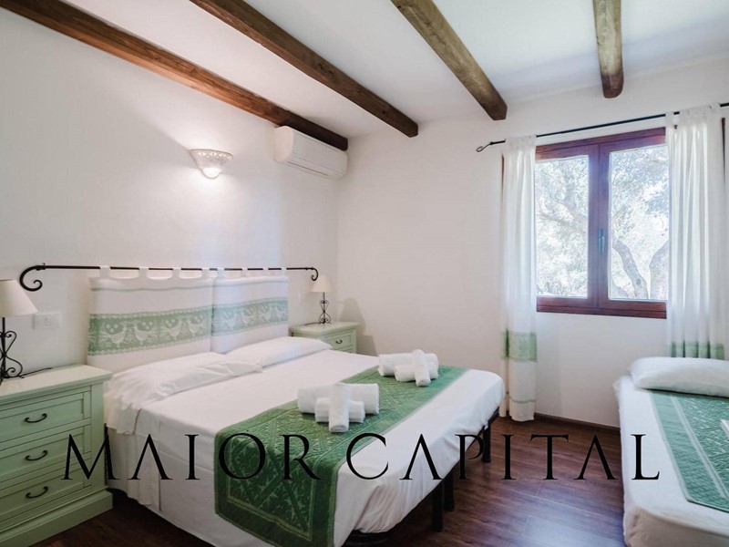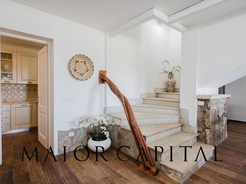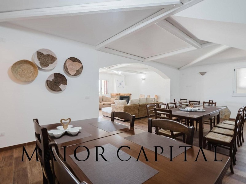 Gli interni, ampi e luminosi, offrono unatmosfera elegante e accogliente. La residenza principale comprende un ampio soggiorno, cucina funzionale, otto camere da letto e otto bagni arredati in stile smeraldino. I mobili intagliati, con motivi tradizionali sardi come pavoncelle e gigli, donano un tocco raffinato e identitario.