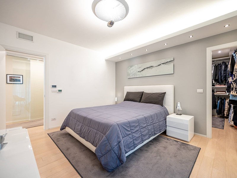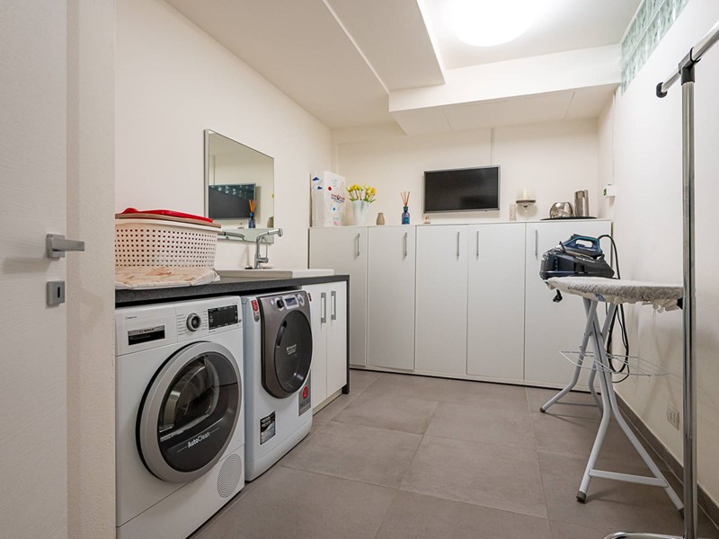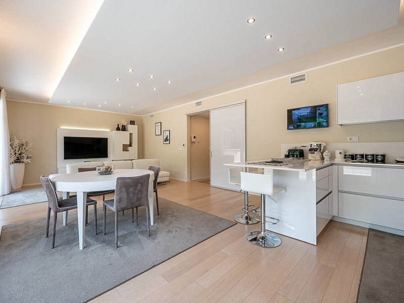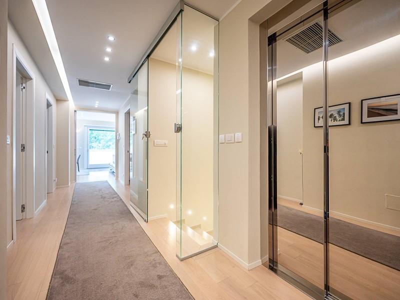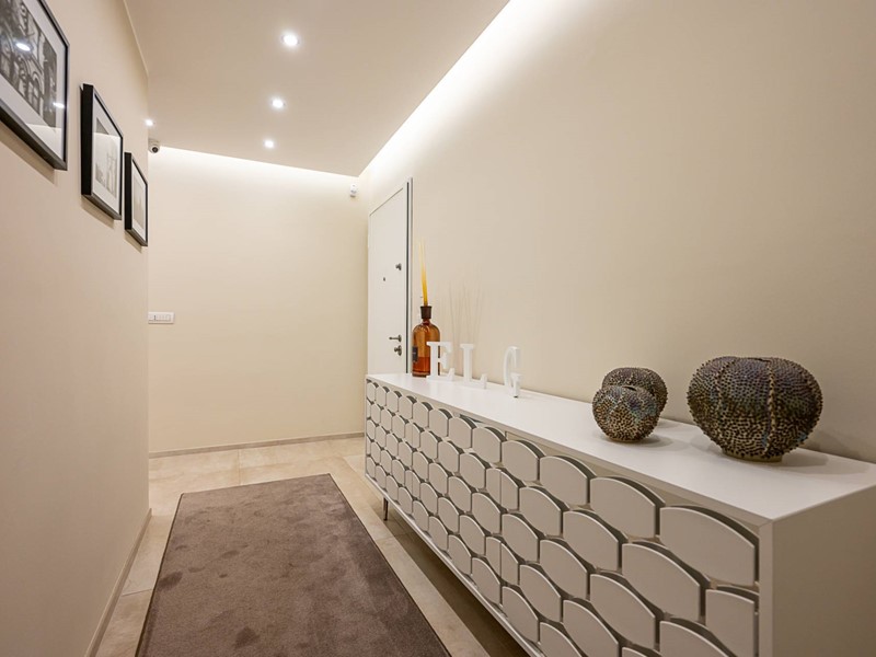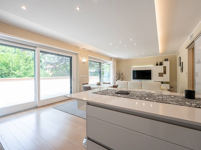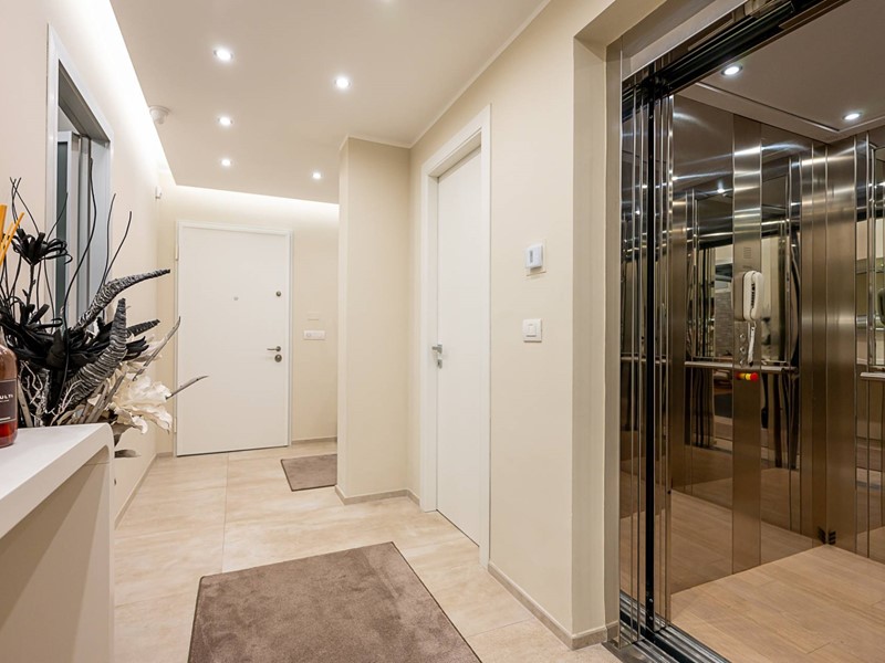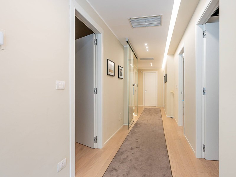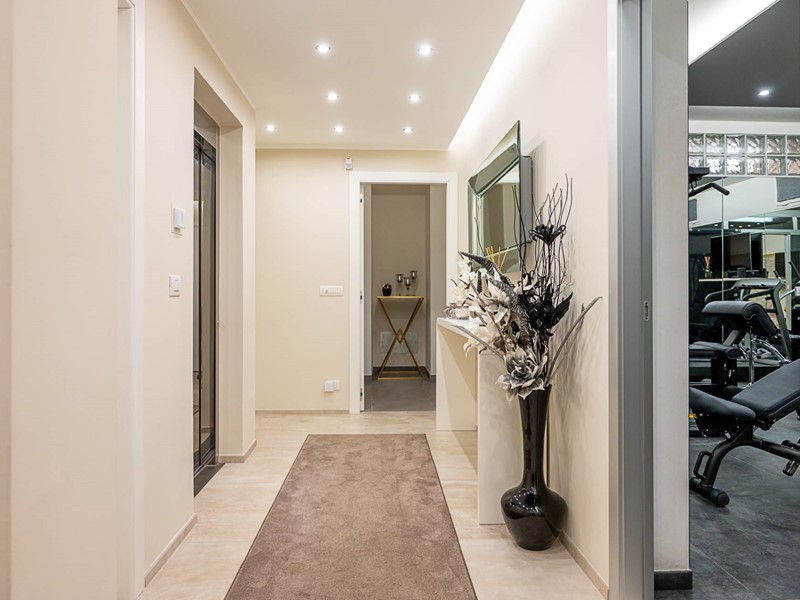 L'appartamento è composto da ingresso, ampio soggiorno con sala da pranzo e cucina a vista, tre camere di cui una con cabina armadio, due bagni e ripostiglio; al piano seminterrato, collegato tramite ascensore, un'ampia autorimessa per tre auto e una cantina attualmente utilizzata come palestra.