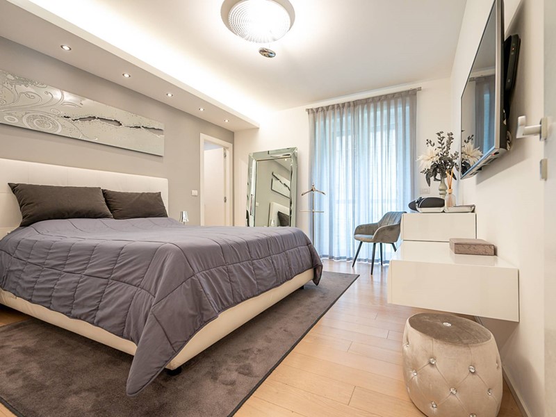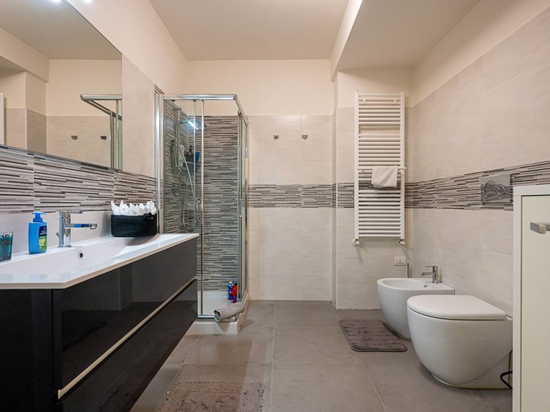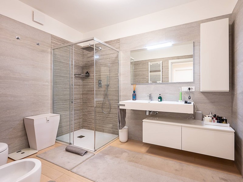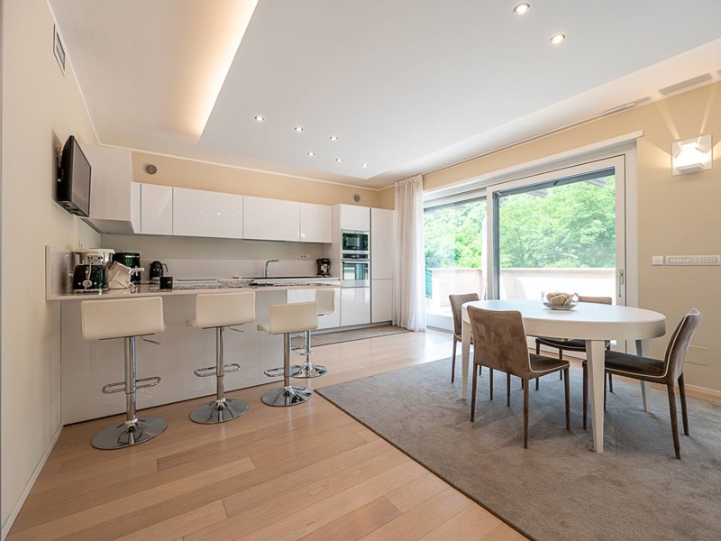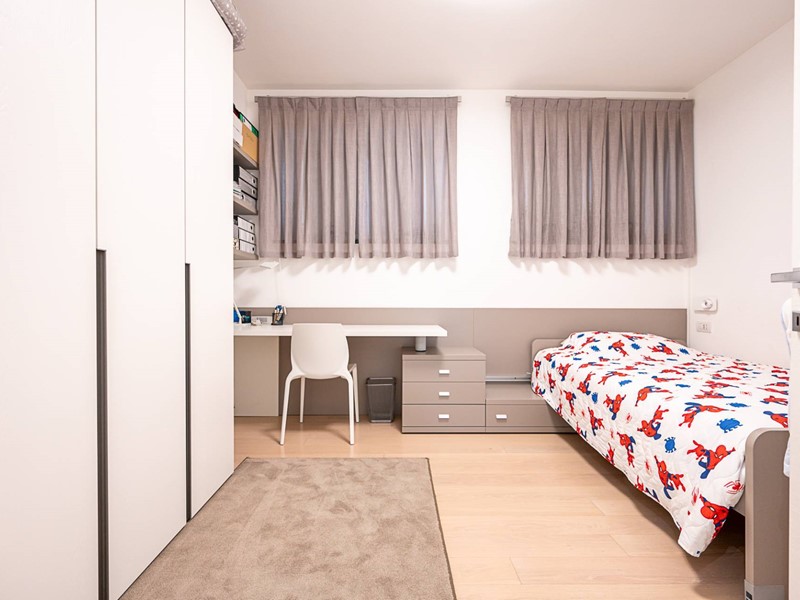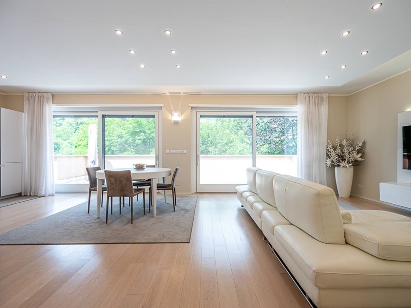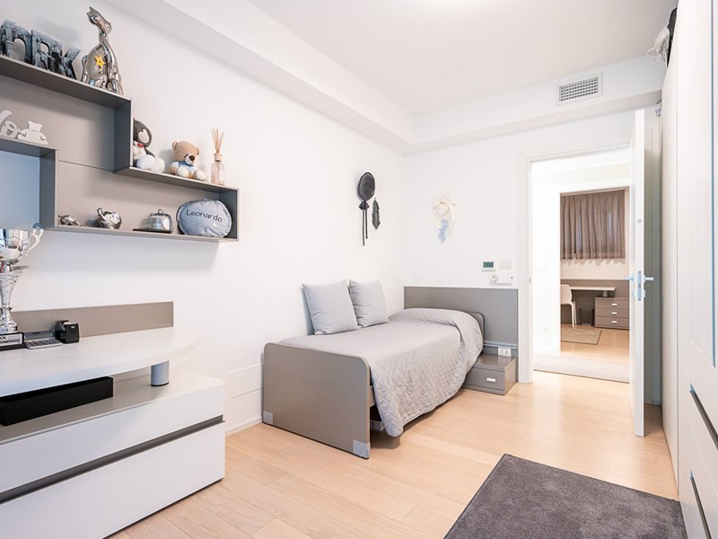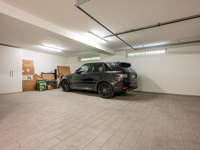 L'appartamento è composto da ingresso, ampio soggiorno con sala da pranzo e cucina a vista, tre camere di cui una con cabina armadio, due bagni e ripostiglio; al piano seminterrato, collegato tramite ascensore, un'ampia autorimessa per tre auto e una cantina attualmente utilizzata come palestra.