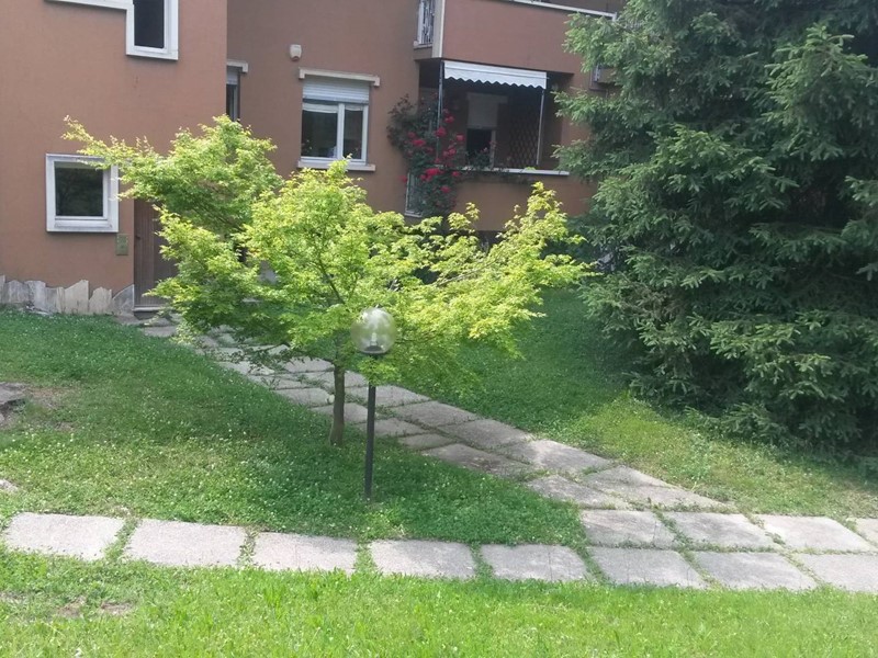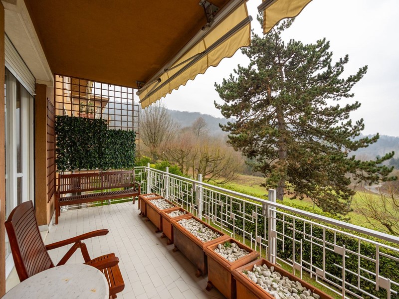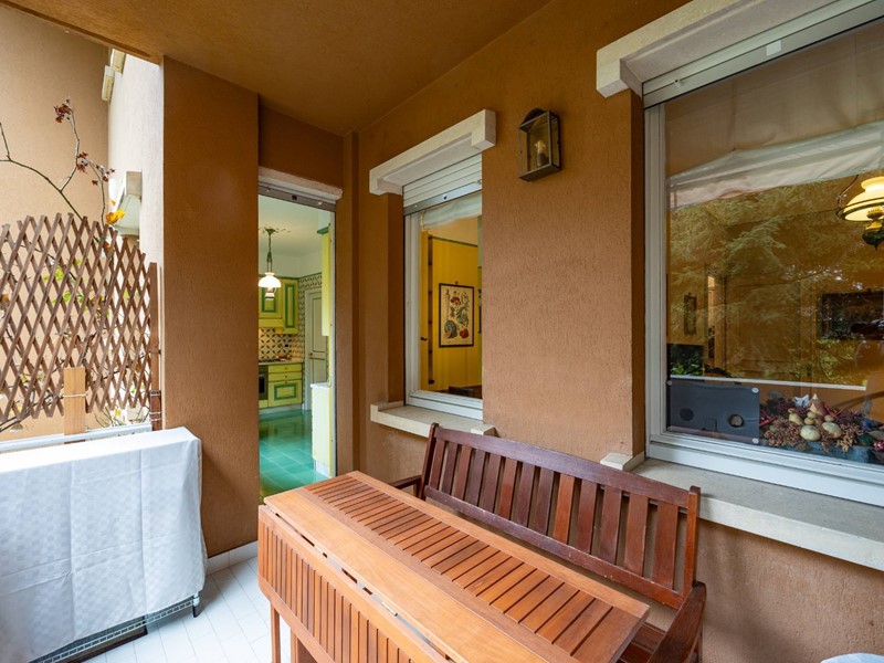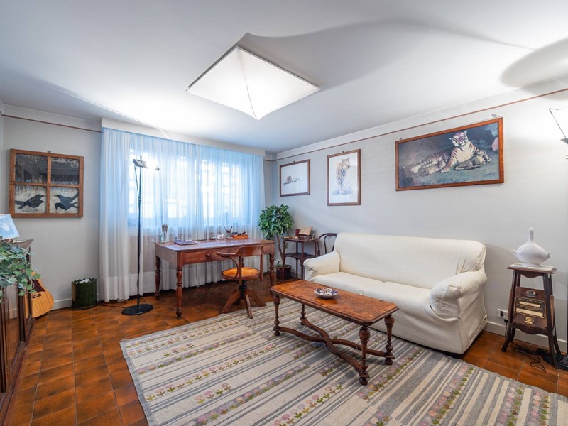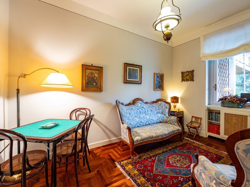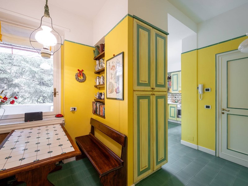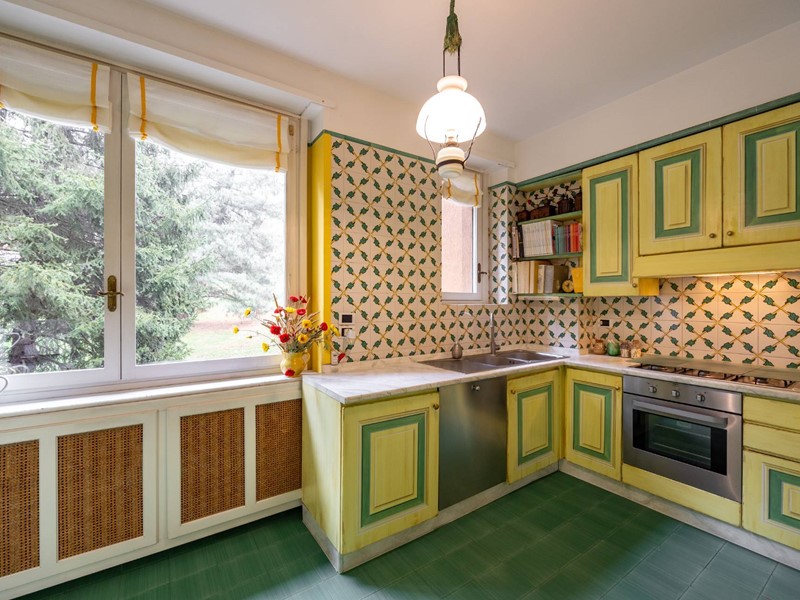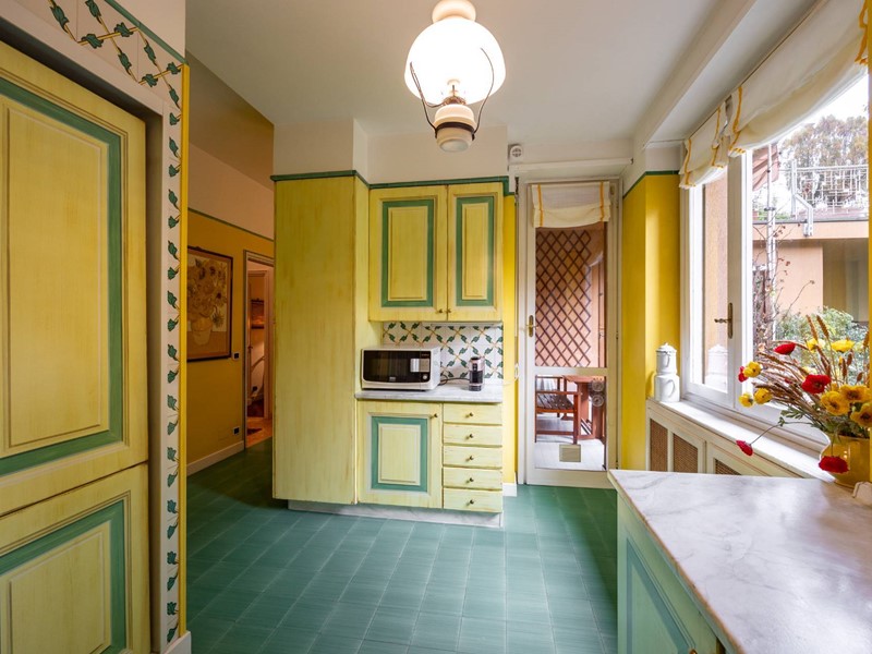 Un disimpegno conduce alla cucina abitabile con vano dispensa e terrazzino lato giardino con ripostiglio esterno, oltre a camera di servizio/studiolo.