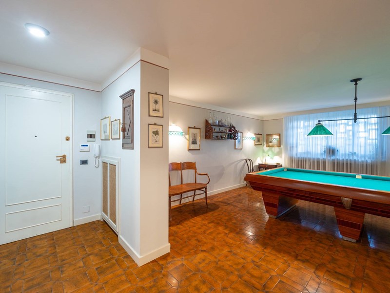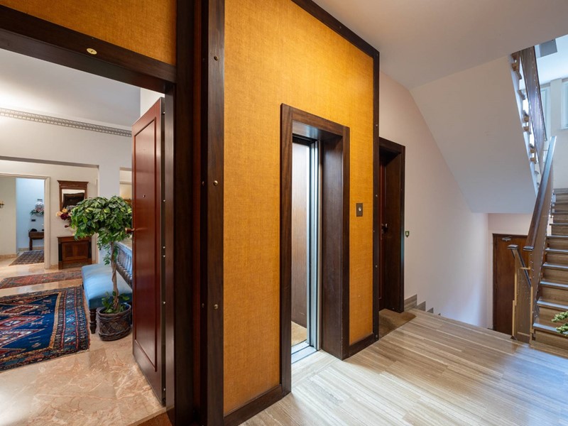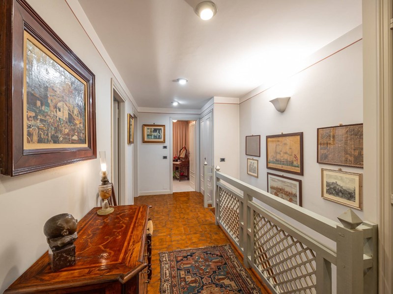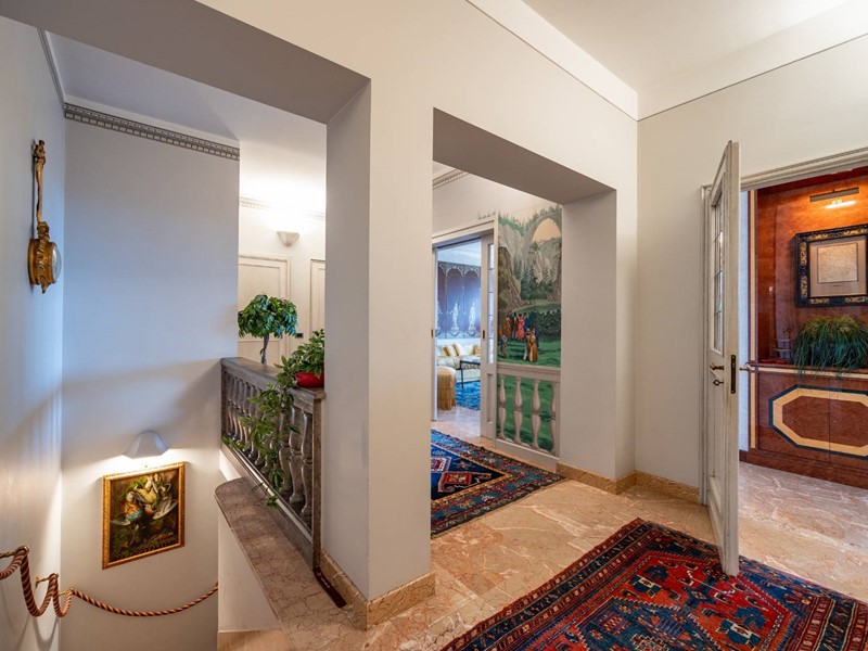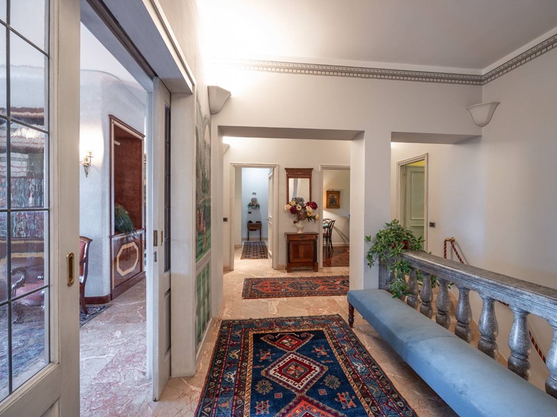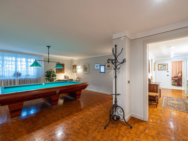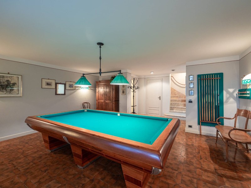 Una importante scalinata marmorea collega il piano inferiore, completamente finestrato sul lato giardino, composto da sala biliardo/tavernetta, vano ripostiglio sottoscala, disimpegno con armadiate su misura, camera ospiti, altra camera ad uso studio con vano celato contenente il pc e stampante, bagno ad uso lavanderia.