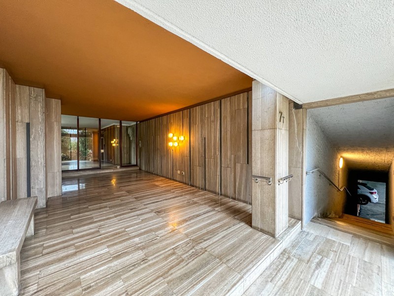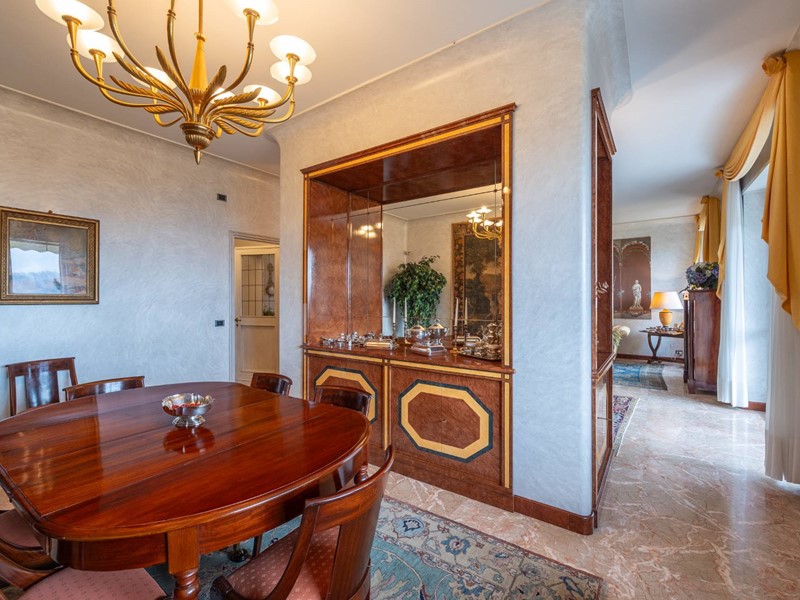 -al piano primo ingresso (con vestire per gli ospiti) impreziosito da papier peint, con ampia porta vetrata scorrevole che accede al salone ampiamente finestrato, con lungo terrazzo e affaccio sul parco e vista aperta sullarco alpino, centralmente troviamo un corpo multipurpose che divide la sala da pranzo.