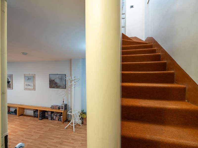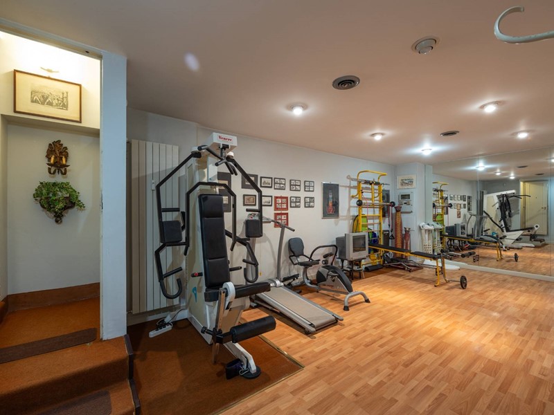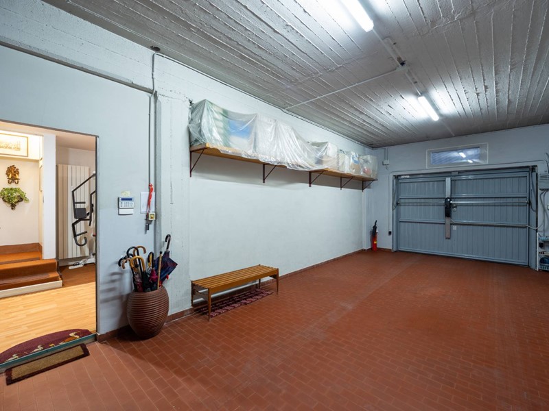 Una scala interna in muratura collega il piano seminterrato che comprende una palestra, una porta corazzata antincendio accede al garage per due autovetture con portone basculante automatizzato, altro locale ad uso cantina.