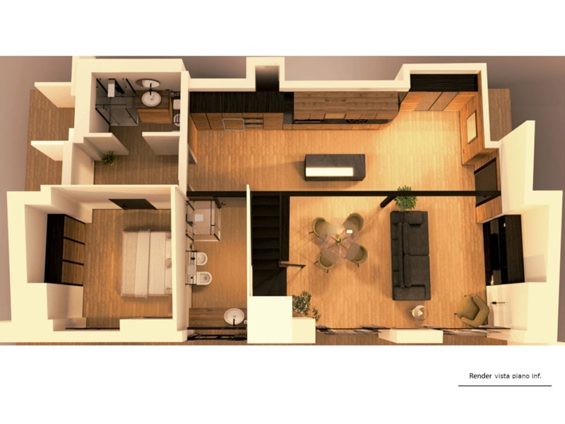 Nello specifico l'Unità bilivello E17 è così composta: Ingresso living su ampio soggiorno con angolo cottura, disimpegno, una camera, bagno; una scala interna in ferro e legno accede alla zona semi mansardata dove è presente una seconda camera, un soggiorno e un bagno