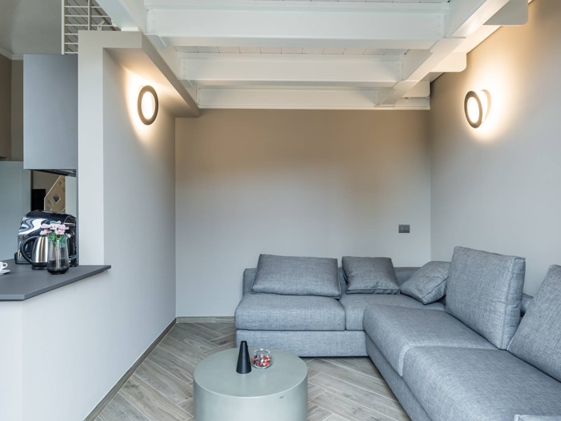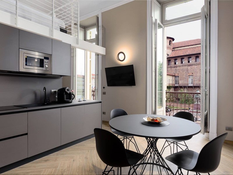 Al piano nobile di un palazzo d'epoca posizionato di fronte al Palazzo Madama, splendido appartamento appena ristrutturato con materiali e accessori di pregio e completamente arredato con mobili di design. Il lotto 5 è composto da ingresso su soggiorno con cucina a vista, camera, bagno, un soppalco aperto sul salone, ad uso cameretta con due letti singoli, ed ha uno splendido affaccio su Palazzo Madama con due balconcini. Lo stabile è dotato di portineria e di doppi ascensori. Riscaldamento e condizionamento autonomi.