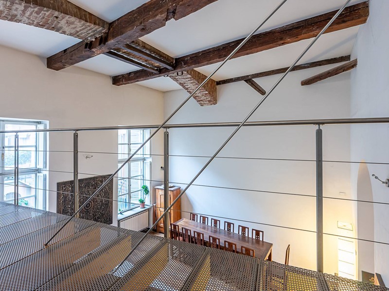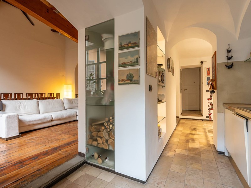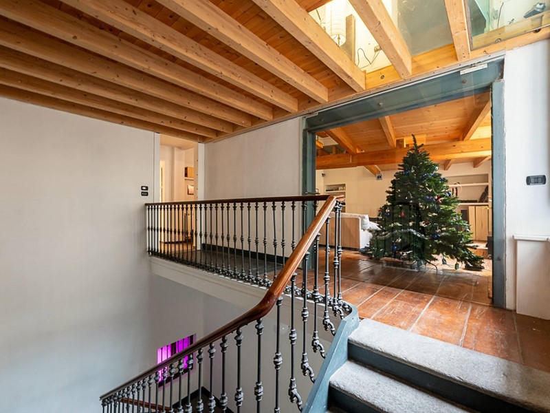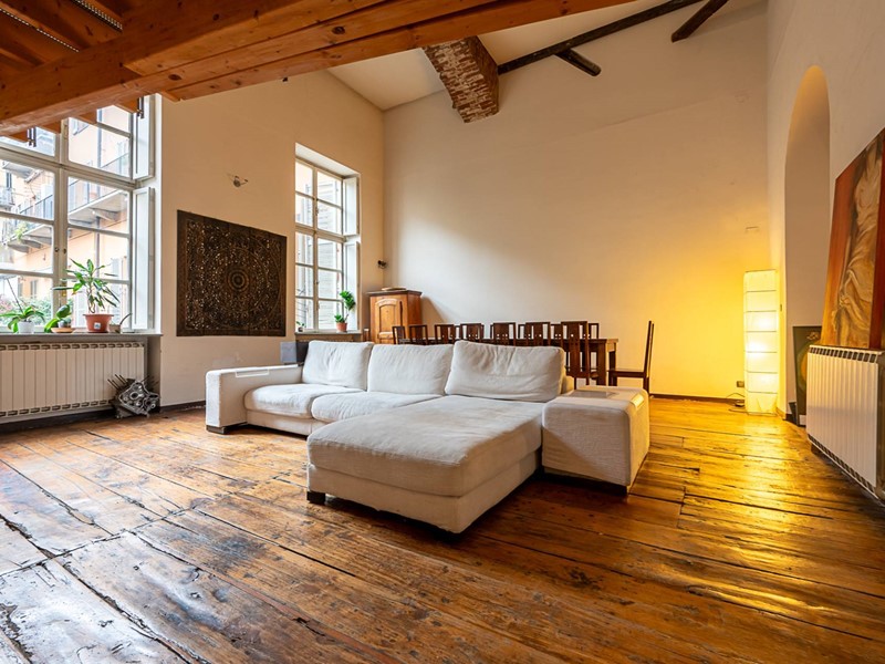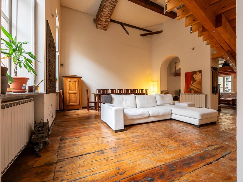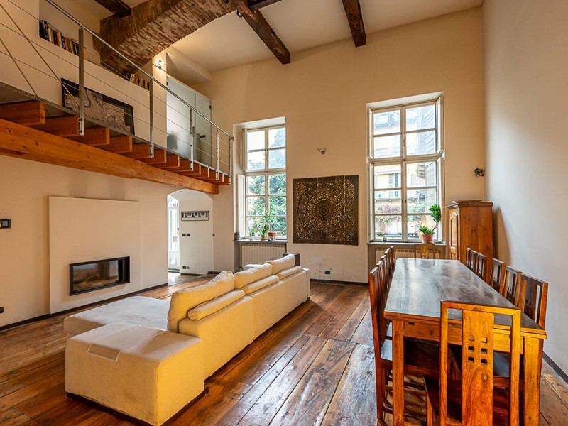 L'entrata del nostro appartamento è in comune con un altro alloggio, due rampe di scale conducono al piano primo. Arrivati al pianerottolo vi è il portoncino blindato che conduce in un open space davvero unico: due grandissimi saloni, di cui uno con camino e sala da pranzo con affaccio sul cortile del palazzo adiacente. E' presente un terrazzino utilizzabile per cene/pranzi nella bella stagione.