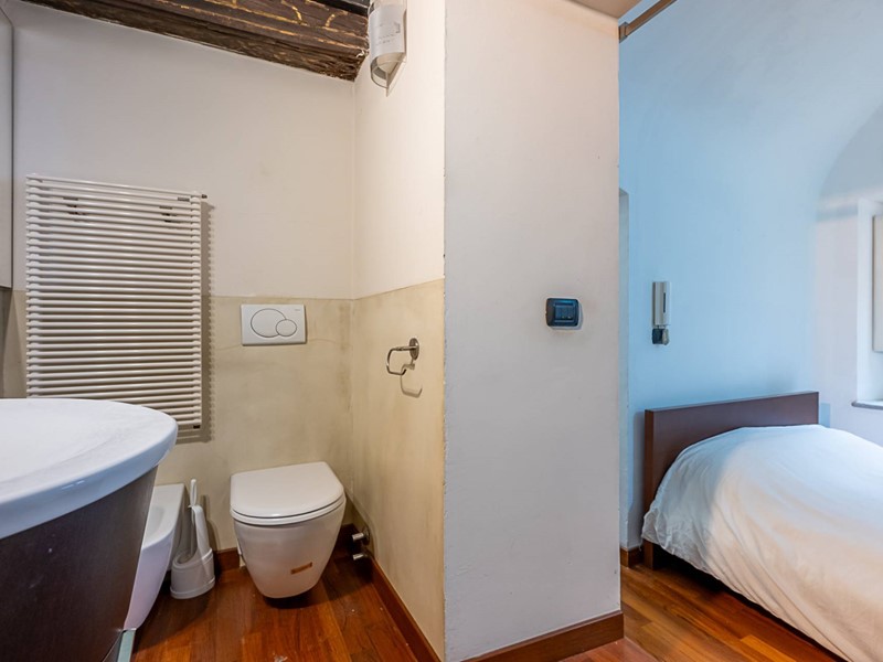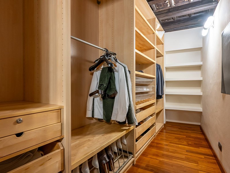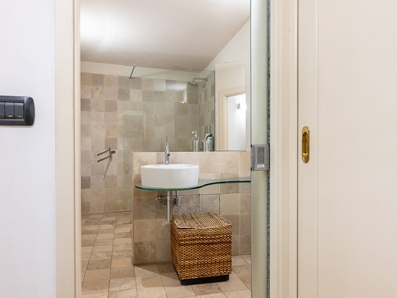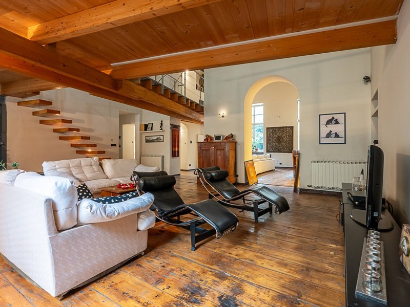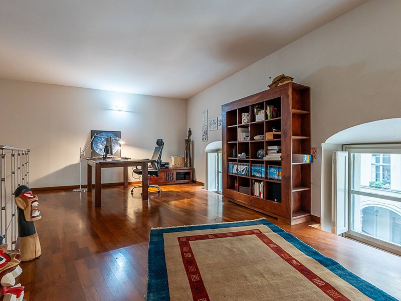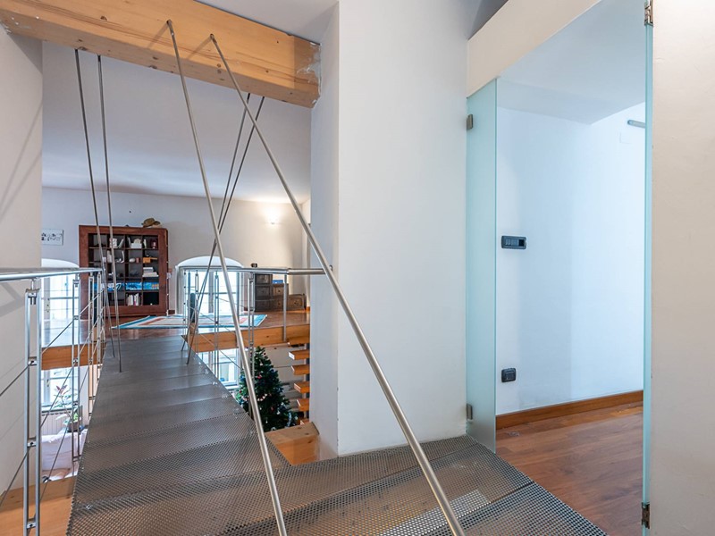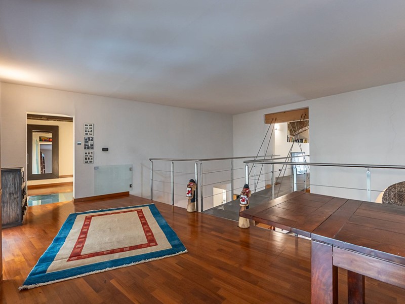 Dalla scala si accede al piano soppalcato dove troviamo una grande sala adibita a studio, un bagno con vasca e una cabina armadio, una camera da letto con bagno in camera e relativa cabina armadio/ripostiglio e un appendice utilizzato come studio.
