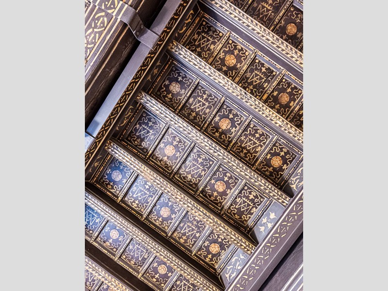 I soffitti sono a cassettoni e conservano le decorazioni originali dell'epoca.