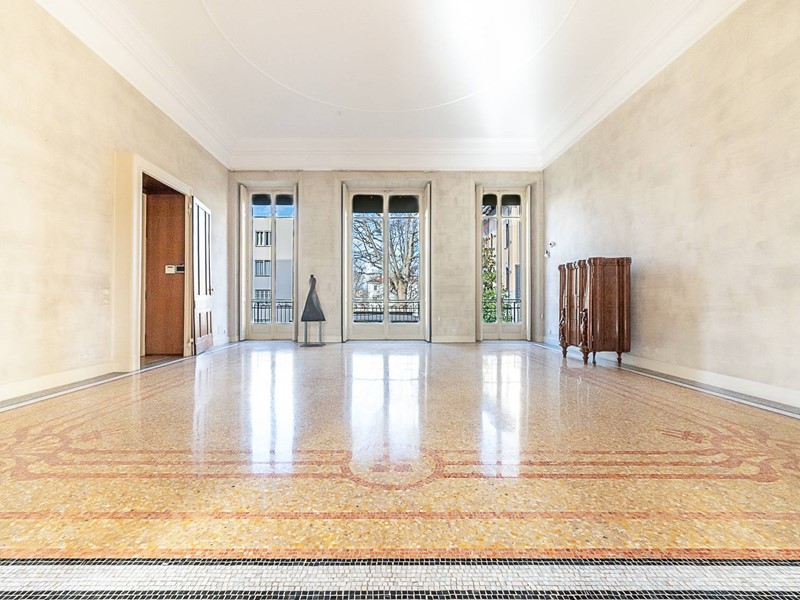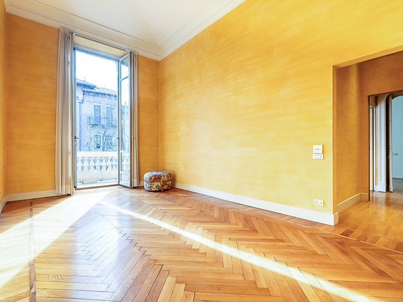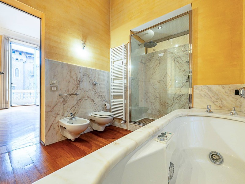 Nella rinomata "Casa Maffei", al primo piano nobile prestigioso appartamento con doppi ingressi finemente ristrutturato, composto da ingresso living su ampio salone con splendido pavimento in marmo decorato e affaccio sul verde della gradevole corte interna, salone di rappresentanza con bellissimo soffitto impreziosito da stucchi e camino d'epoca, bow window e due balconi, sala da pranzo, studio, due camere, camera padronale con bagno en suite e disimpegno armadiato, cucina abitabile, bagno con sauna e doccia, altro bagno, ripostiglio, dal secondo ingresso si accede a ulteriore salone con doppia esposizione e balcone su altro cortile, altra camera.