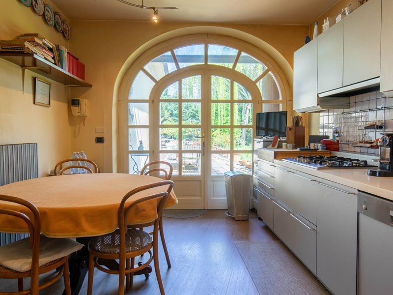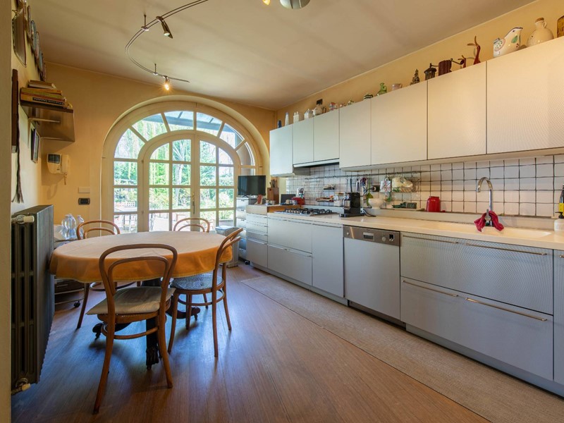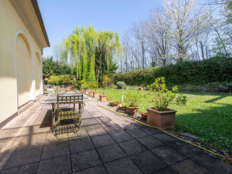 L'immobile, libero su tre lati e collocato all'interno di un contesto condominiale immerso nel verde, risulta così composto: ingresso su ampio salone con sala da pranzo e studiolo, cucina abitabile con accesso al giardino, tre camere da letto, tre bagni di cui due finestrati; completano la proprietà una cantina di pertinenza, un ampio box auto e un fabbricato esterno accatastato ad uso deposito.