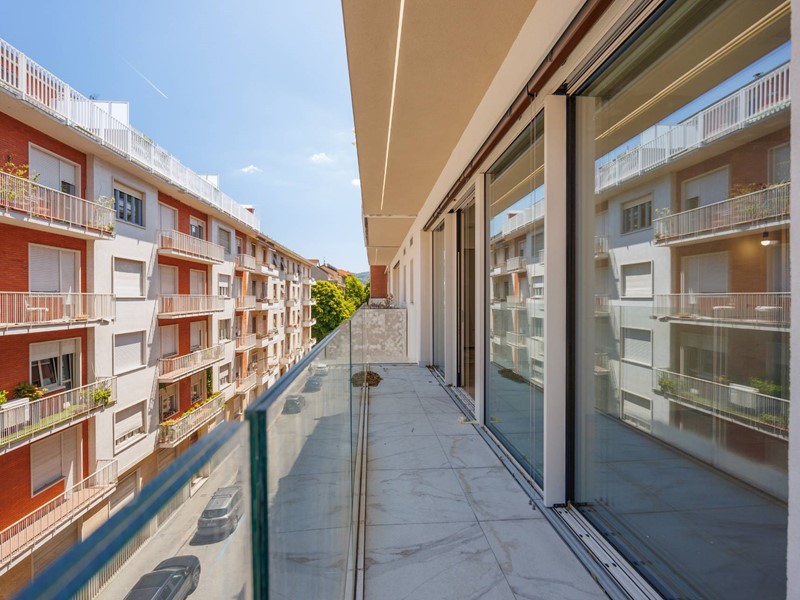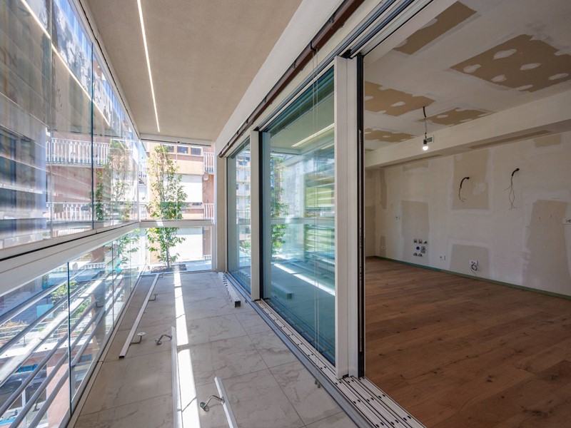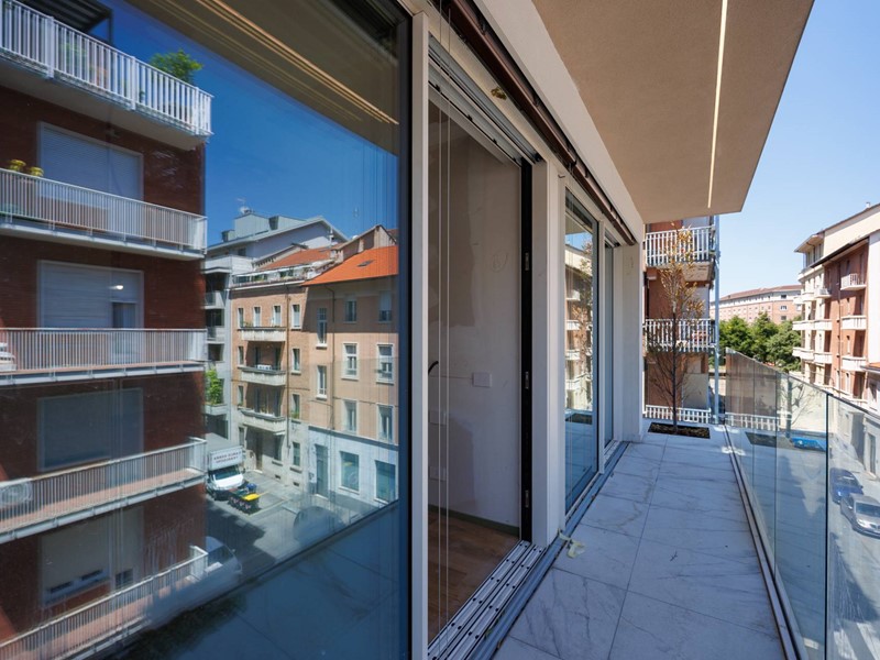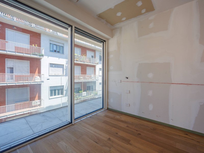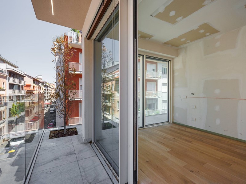 L'appartamento è composto da un ingresso, zona giorno con il soggiorno-pranzo con cucina a vista e vetrate scorrevoli che si aprono su un ampio balcone-serra solare, schermato da brise-soleil, la zona notte con una camera matrimoniale con bagno in suite e balcone, seconda camera con balcone angolare, secondo bagno con finestra. Le immagini propongono render degli interni, oltre alle foto degli spazi in fase di ultimazione.