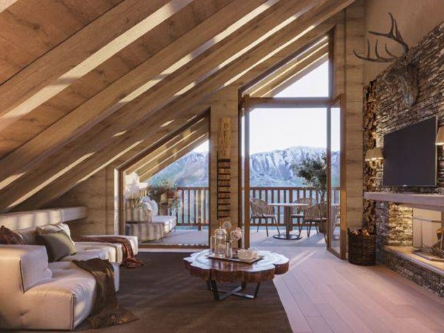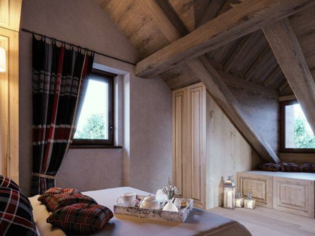 ALLOGGIO 5: un trilocale duplex posto al piano primo e sottotetto della CASA B, composto da ingresso, camera da letto e bagno, ampio soggiorno con camino, cucina, camera da letto matrimoniale, un secondo bagno e un comodo ripostiglio. I soffitti in legno a vista ripropongono il fascino della struttura tradizionale in legno. Completa l'alloggio un terrazzo esxlusivo antistante il soggiorno di 12mq, oltre ad area esclusiva di 7mq sul retro, con una vista impareggiabile sulle montagne.