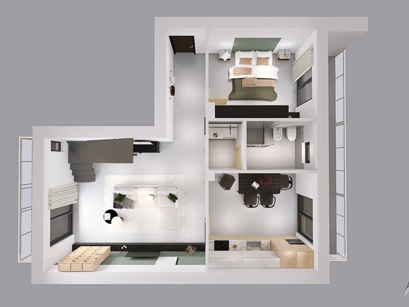 Primo livello, ingresso, camera da letto doppia, bagno con antibagno, la grande zona giorno è composta da cucina abitabile con balcone e salone di 26 mq, con balcone