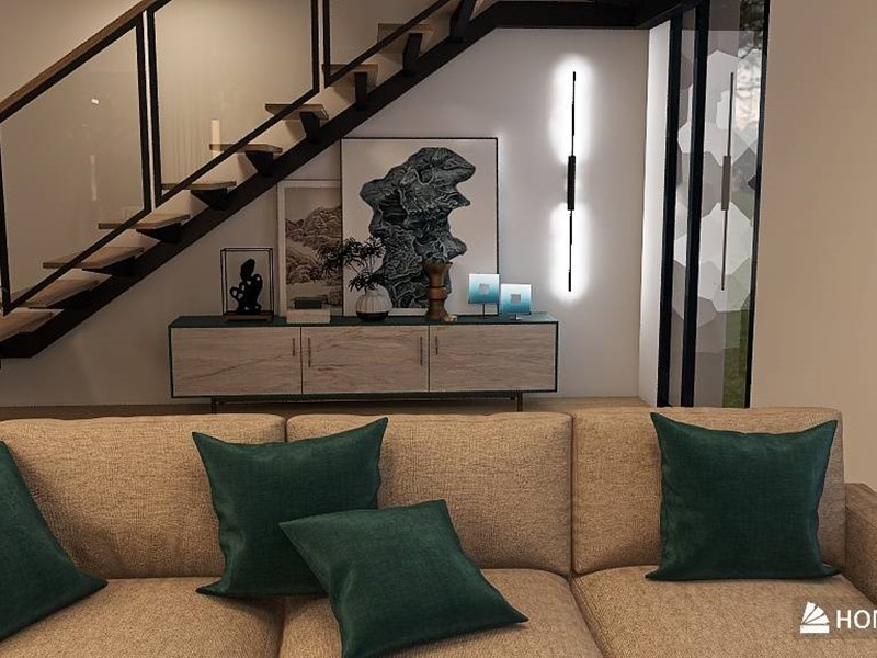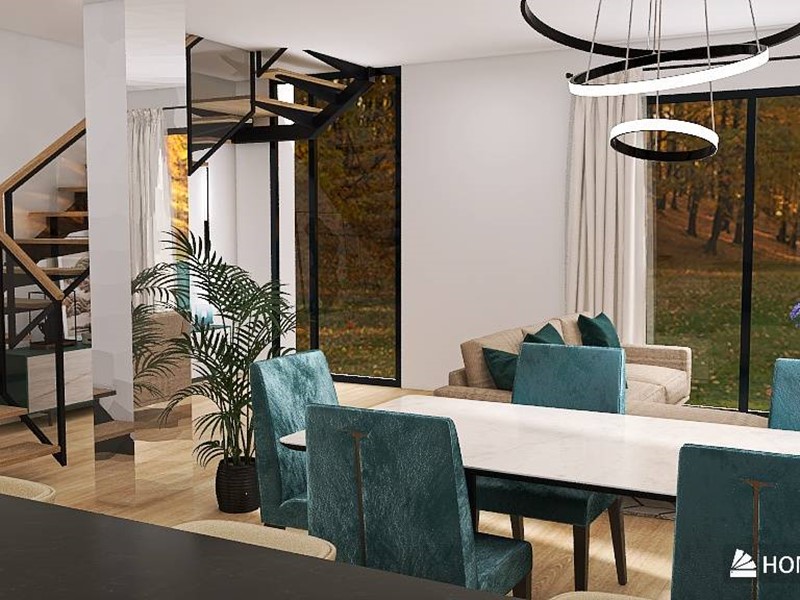 La scala moderna, un elemento decorativo che arricchisce l'ambiente, è illuminata dalla grande vetrata che collega il piano inferiore con il piano superiore, creando un passaggio di luce e spazio , con la sua ampiezza, la la vetrata non solo illumina la scala, ma contribuisce anche alla creazione di un ambiente aereo e spazioso.