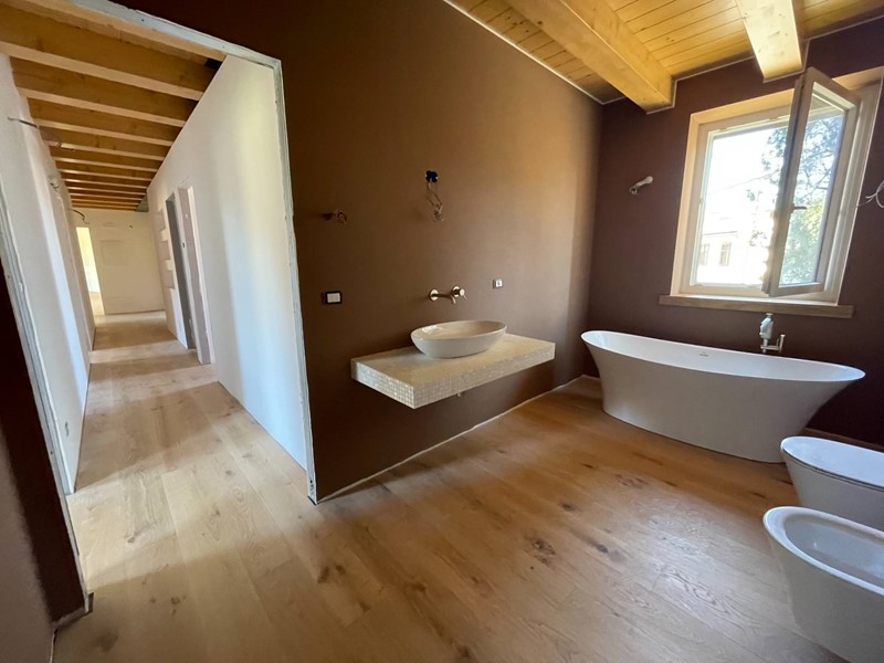 La zona notte offre tre camere da letto, di cui una padronale con cabina armadio privata. Due bagni spaziosi, moderni e funzionali, completano il piano.