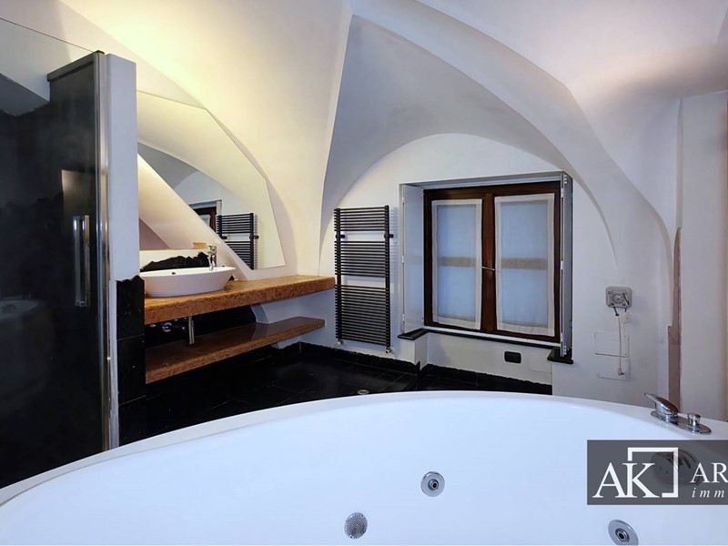 Una scala ci conduce alla zona soppalcata ed al bagno con vasca angolare idromassaggio e doccia.