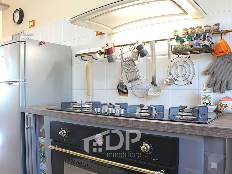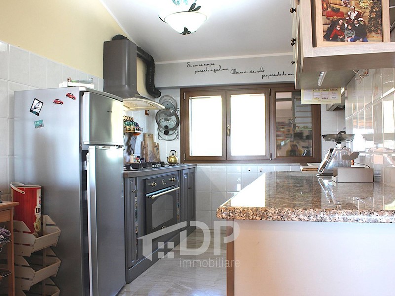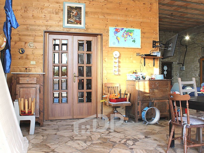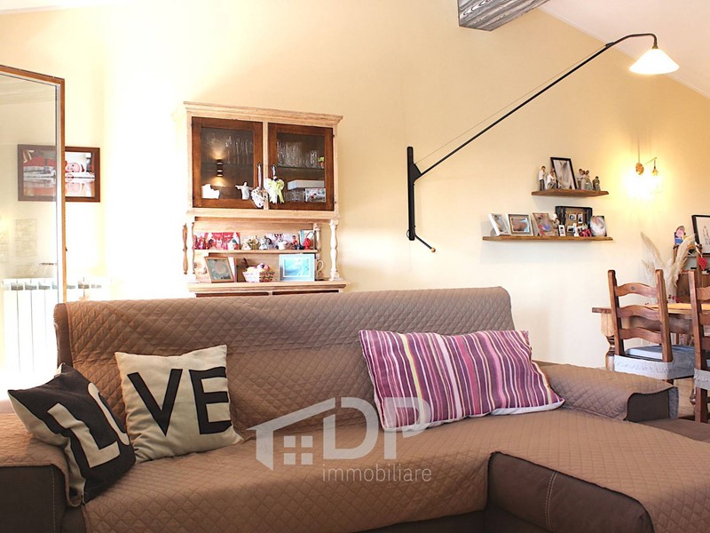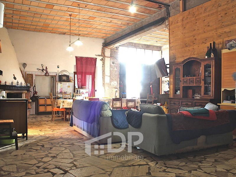 Il salone con camino è il centro di questa casa. Luogo perfetto per trascorrere serate invernali davanti al fuoco e condividere momenti speciali, con il cucinotto a vista i cui arredi sono compresi nella vendita.
