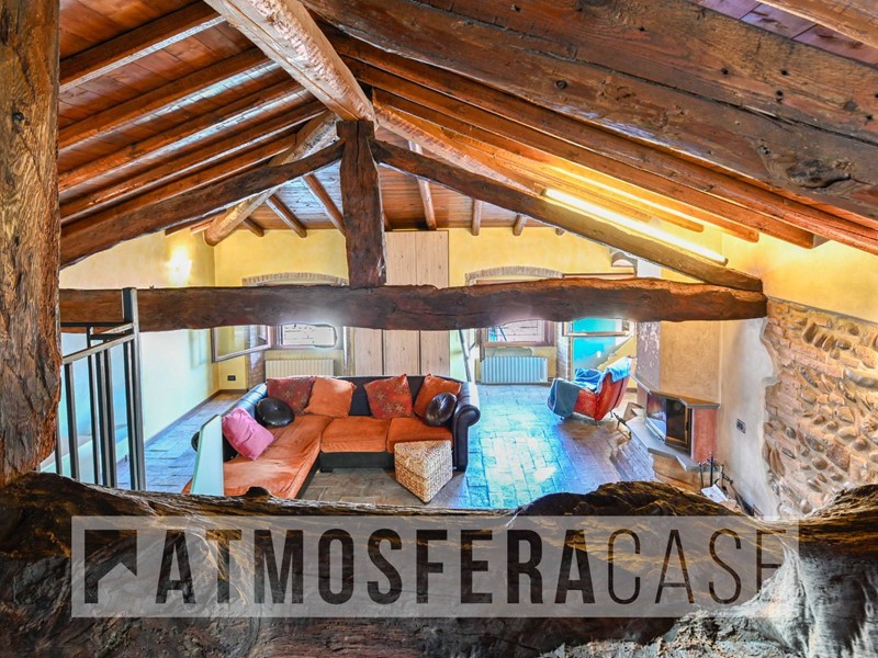 I gradini in pietra conducono all'ampissimo soggiorno dotato di camino con bocchette per la distribuzione del calore, doppia esposizione e soppalco a vista dove troviamo la camera da letto matrimoniale con pavimentazione in parquet.