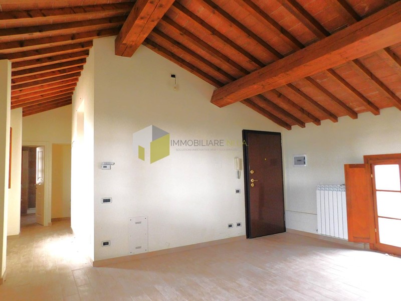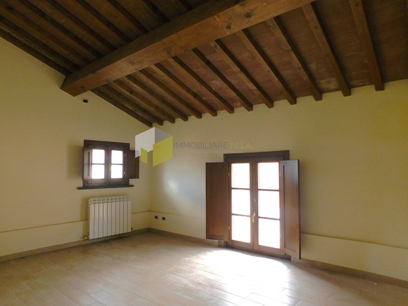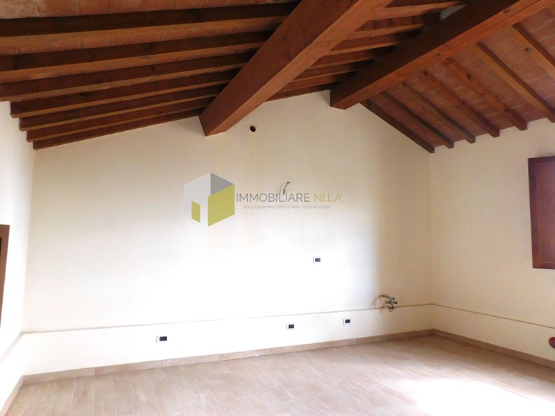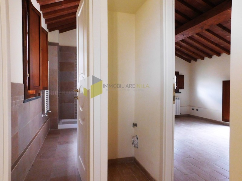 Le finiture sono molto curate: colpiscono i mosaici del bagno, in elegante nuance grigio/tortora, la pavimentazione in gres effetto legno sempre nelle gradazioni del tortora, le porte interne bianche pantografate con motivo design ovale moderno ed essenziale, e gli infissi in legno e doppio vetro camera che esaltano le screziature più scure, riprese dalle travi e travicelli del tetto a vista che dona un sofisticato e lieve accento rustico toscano allintero ambiente, scaldandolo e rendendolo davvero molto accogliente.