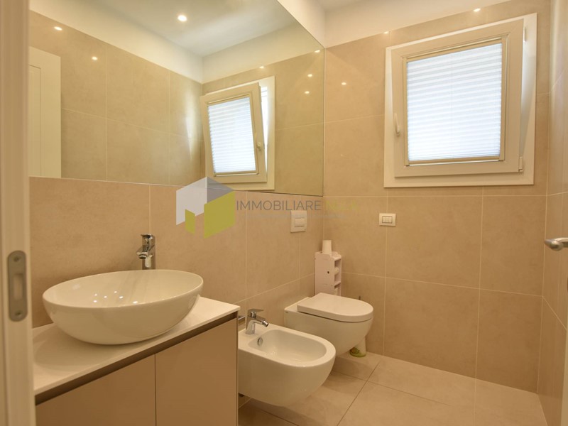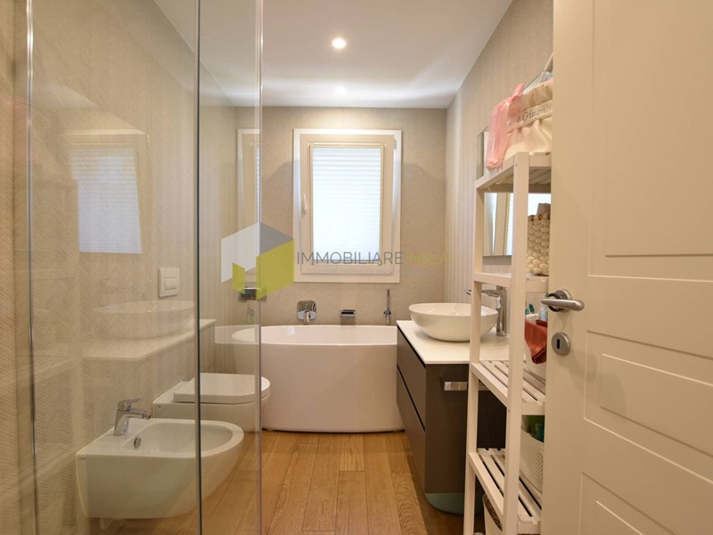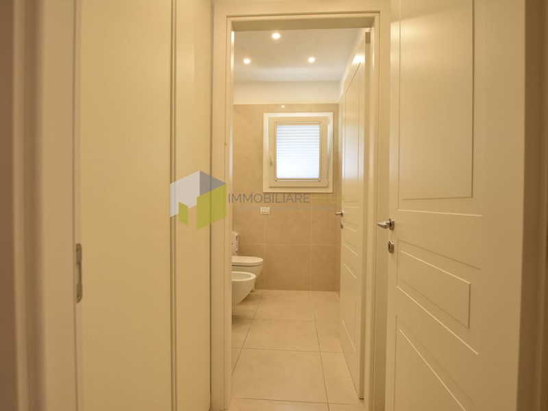 Unelegante scala conduce al piano primo, nella zona notte, dove troviamo una bella camera matrimoniale con ampia terrazza, la camera singola con balcone e il bagno con doccia, vasca e finestra.