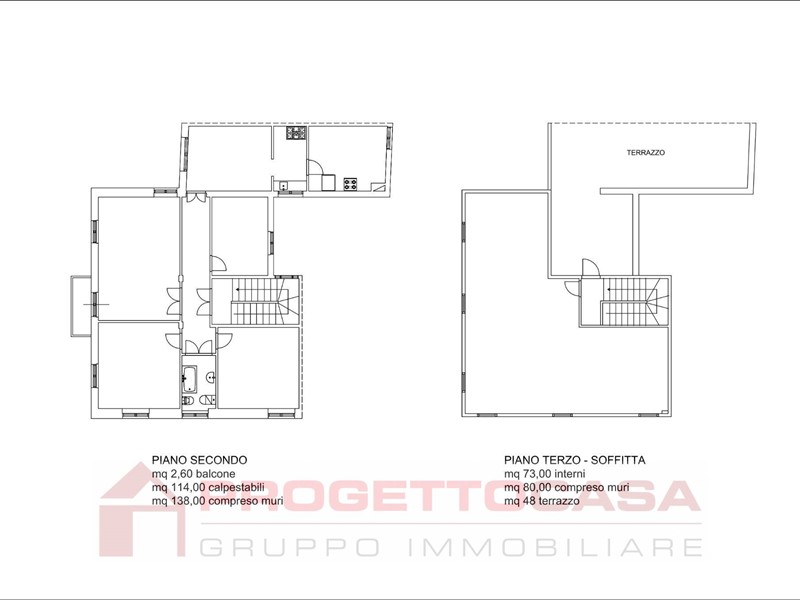 Appartamento di 138 mq circa, posto al 2° piano senza ascensore di una piccola palazzina, composto attualmente da ingresso su disimpegno, n. 6 locali/stanze, n.1 bagno ed un balconcino di 2,60 mq c.a. lato Est. Tramite la scala condominiale si accede al piano 3° di proprietà esclusiva comprensivo di un locale soffitta di 80 mq c.a. con altezza variabile allo stato grezzo e unampia terrazza di 48 mq c.a.