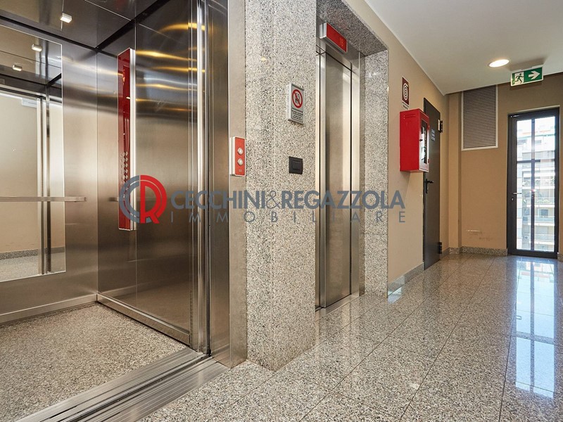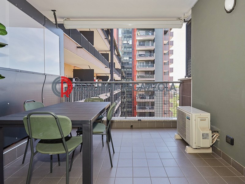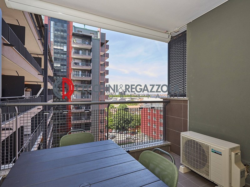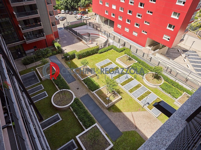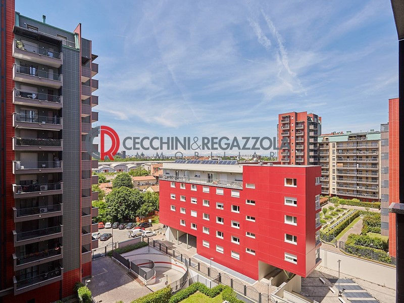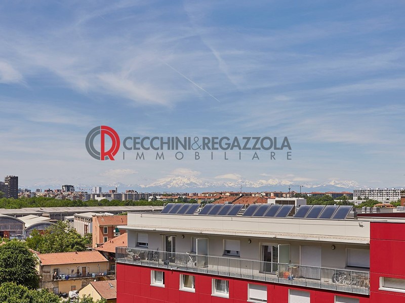 La posizione al piano sesto offre una vista panoramica sullo skyline contemporaneo dei palazzi circostanti e, nelle giornate più limpide, consente di ammirare incantevoli tramonti che si stagliano sulle montagne a nord di Milano.
