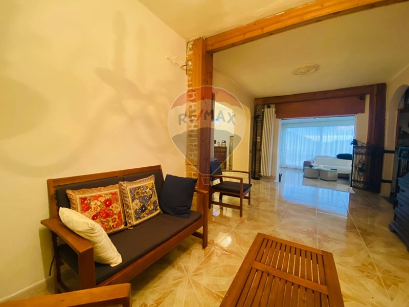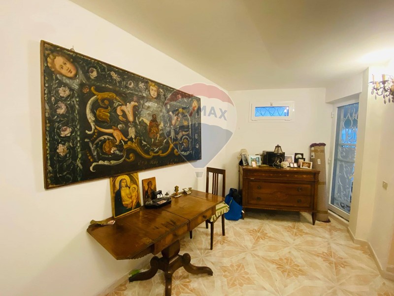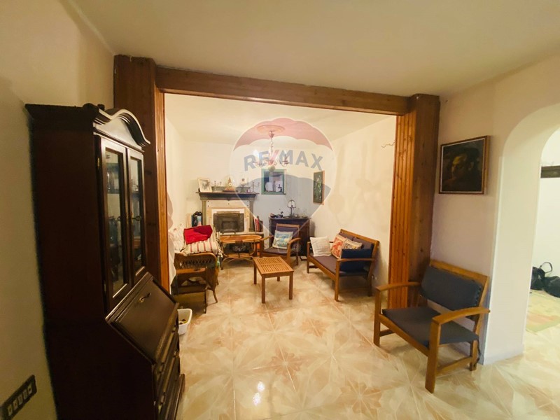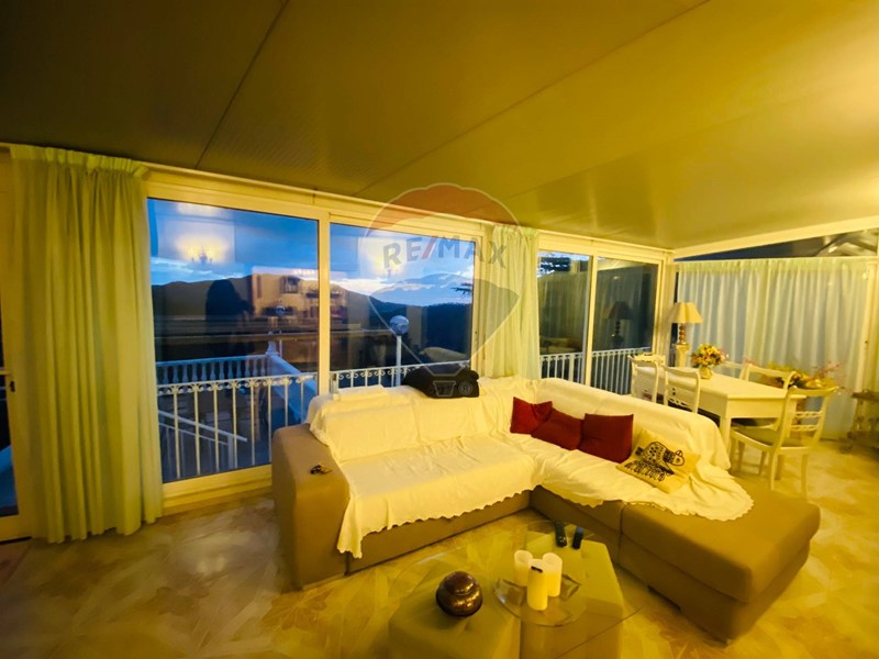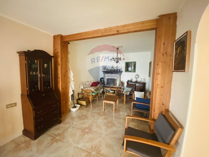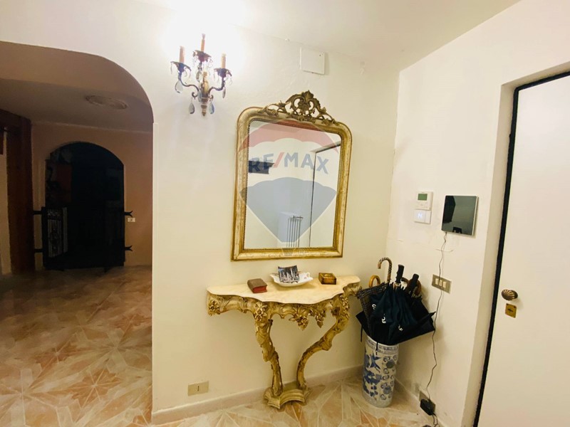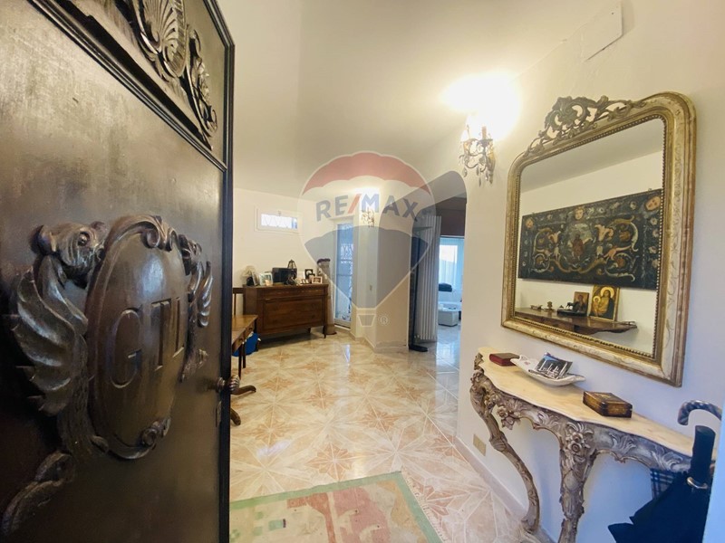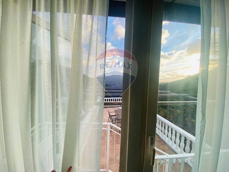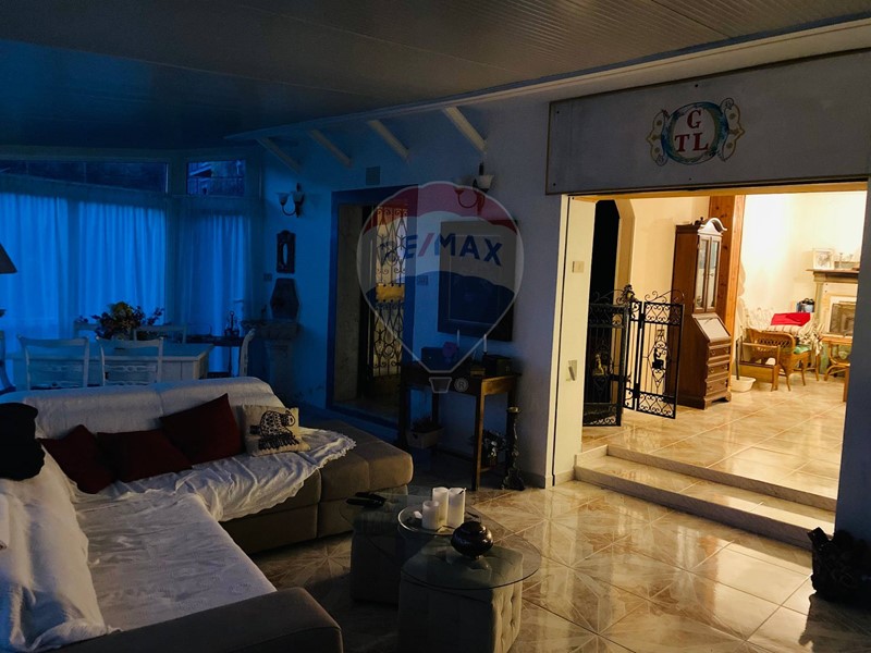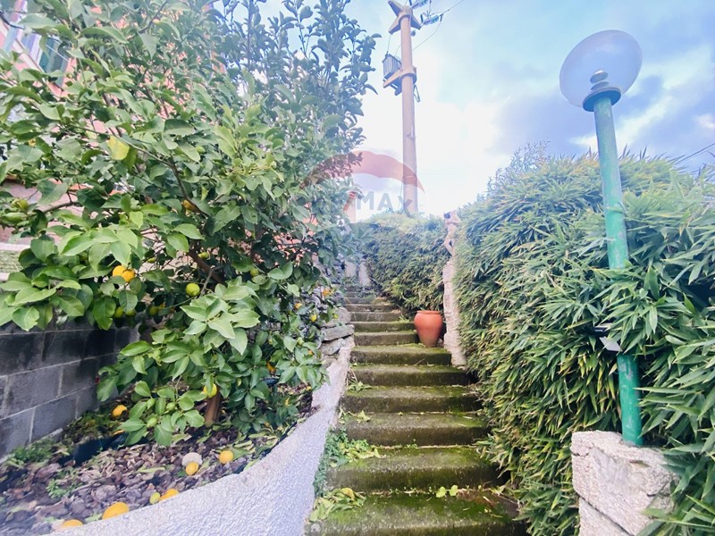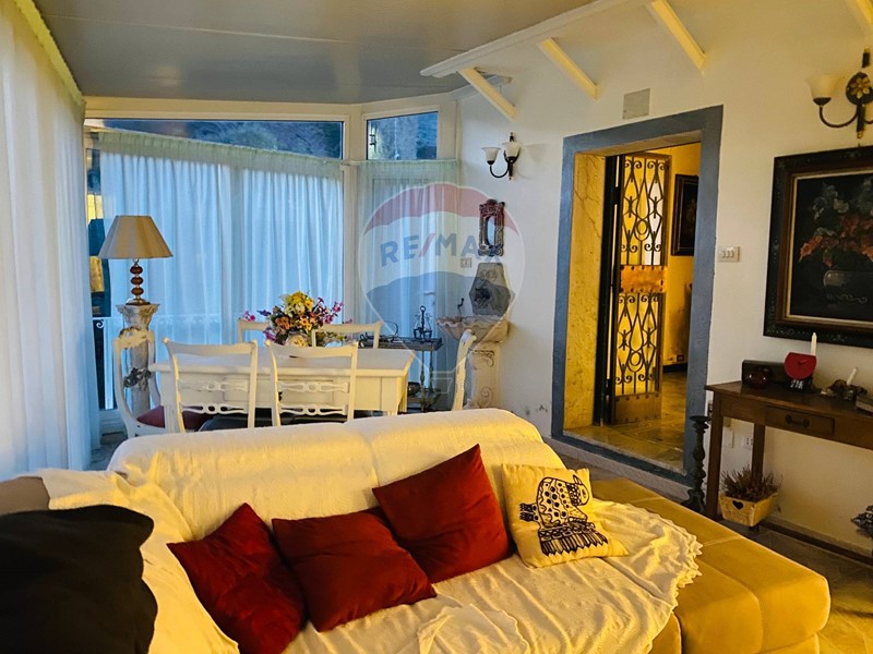 Per accedere all'abitazione, si entra da un cancello e si scende una scala a S contornata da piante, fiori e lampioni che illuminano il percorso. All'ingresso vi aspettano due colonne e un portone in legno massiccio con porta blindata. Entrando, troviamo un ampio ingresso, una sala centrale con camino che divide l'ingresso dalla cucina e dal cucinotto. Una spaziosa veranda offre una vista mozzafiato sulla valle e sul mare.