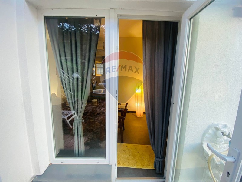 Attraverso una scala in ferro battuto si raggiunge il giardino con una fontana in pietra e diverse colonne che adornano la casa.