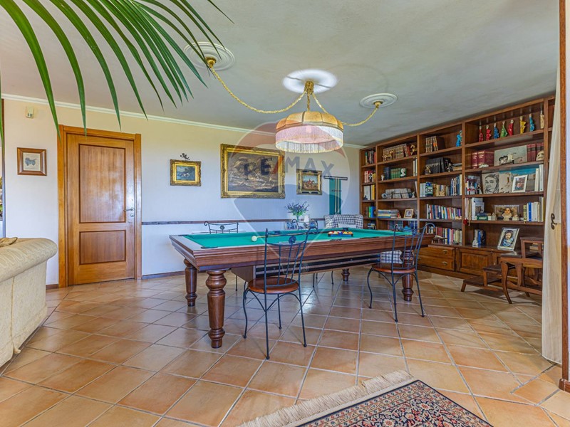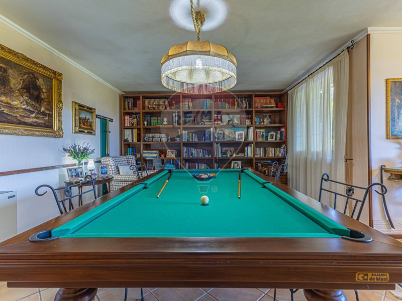 Ampio salone tripartito in zona conviviale con tavolo/biliardo, salotto relax con vetrata panoramica e area conversazione con camino;