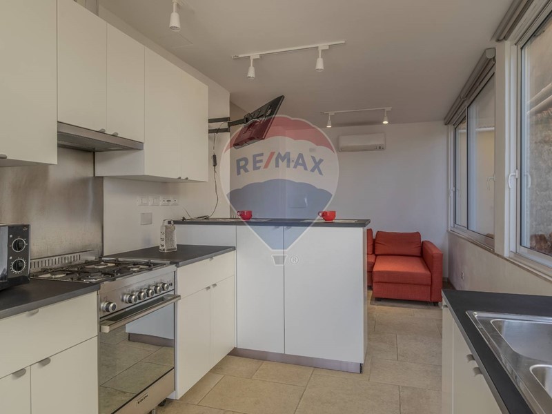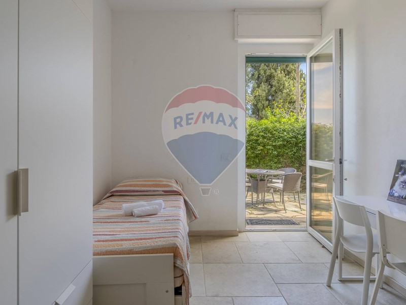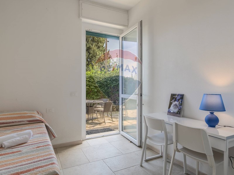 La cucina, anch'essa completamente arredata e accessoriata, è separata dalla zona pranzo e offre un comodo accesso al giardino privato di 60 mq, perfetto per godersi momenti di relax all'aperto.