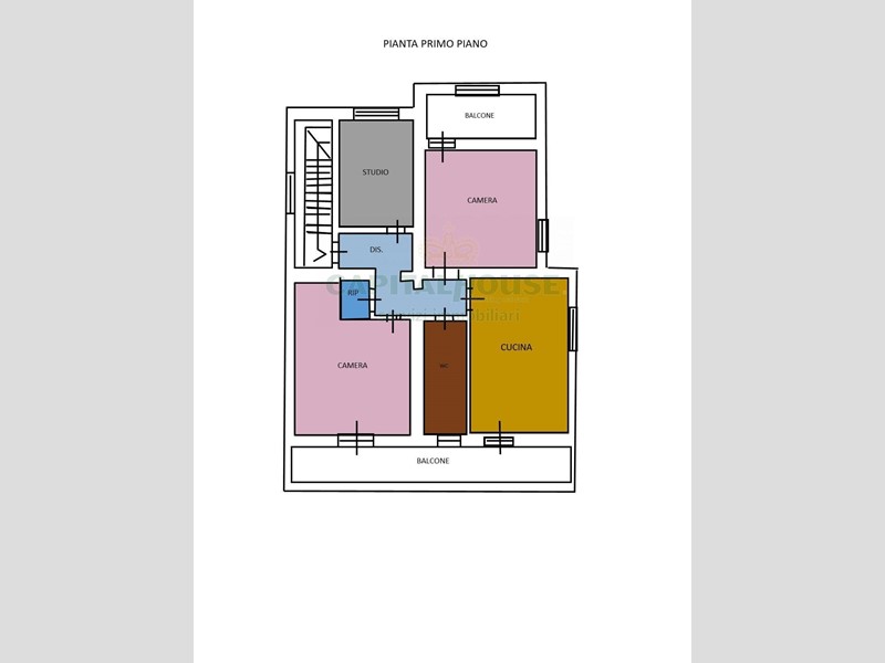 il primo piano ed ultimo composto da una cucina abitabile, uno studio, due camere, un bagno e un ripostiglio, un balcone di 19 mq.
