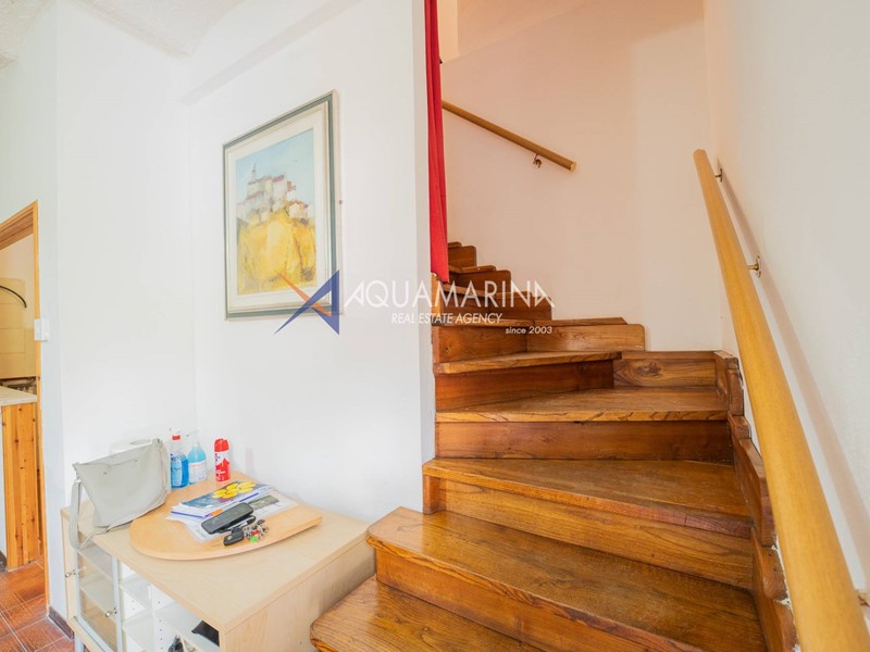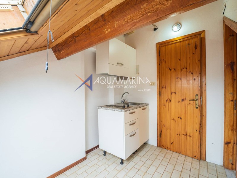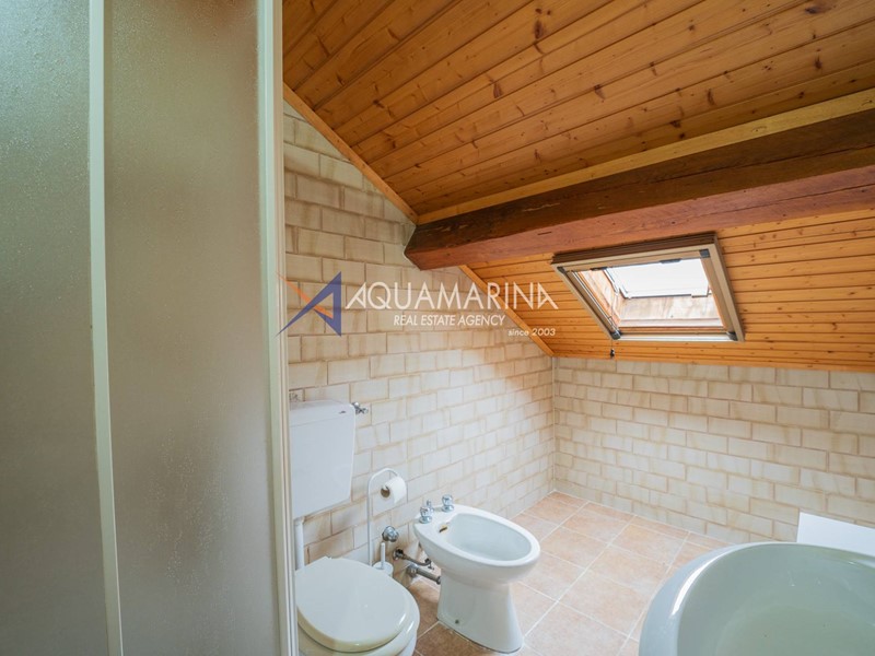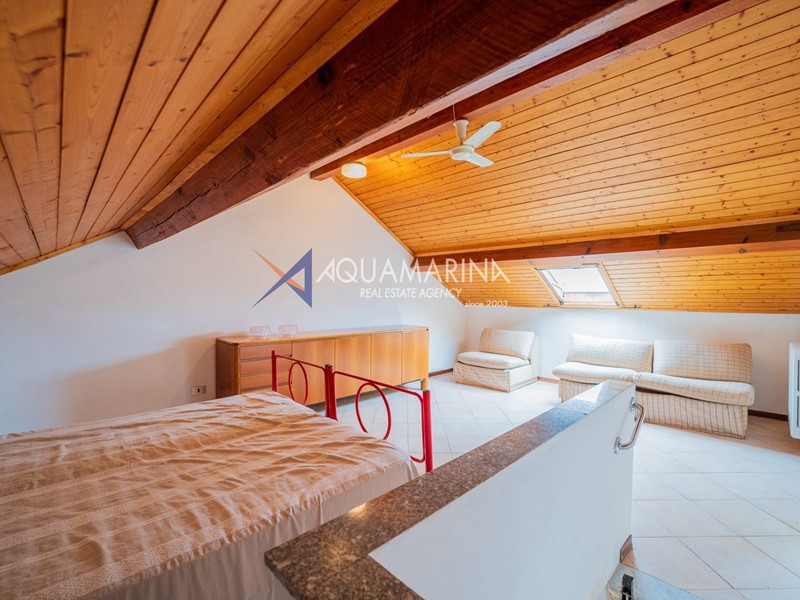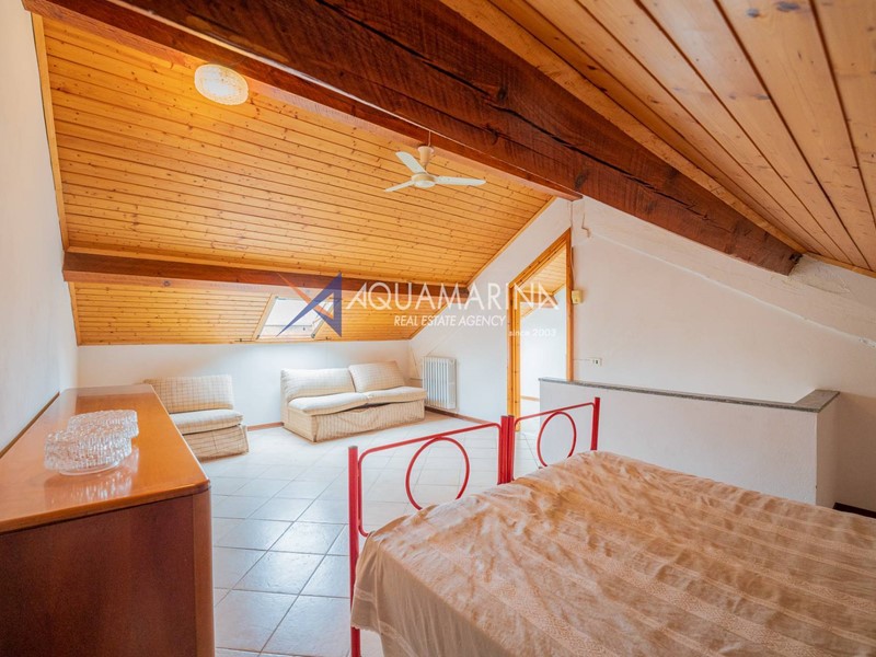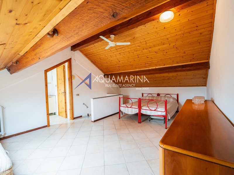 L'immobile, disposto su tre livelli e con una superficie di 150 mq, è composto al piano terra da ampio living con cucina a vista che affacciano sul giardino e veranda esterna; al primo piano da una camera da letto matrimoniale e una camera per gli ospiti, entrambe con accesso diretto al terrazzo, e un bagno con box doccia; all'ultimo piano mansardato da un'ampia camera da letto con cucinotto e bagno.