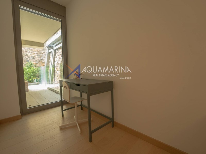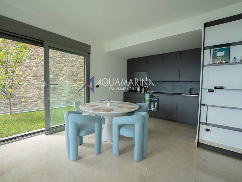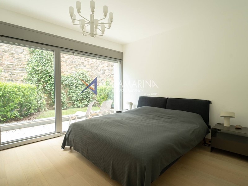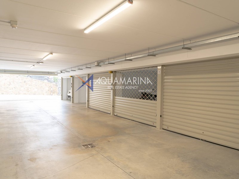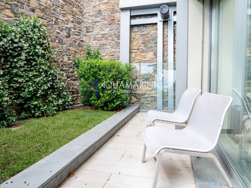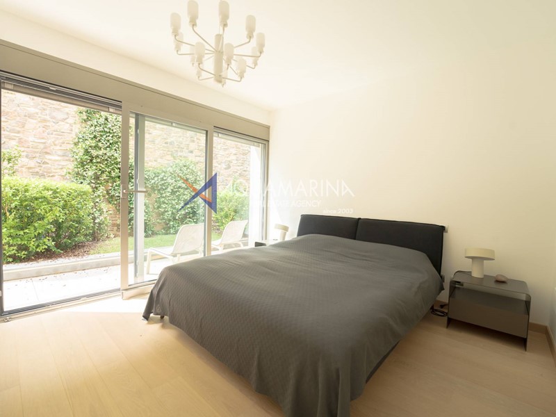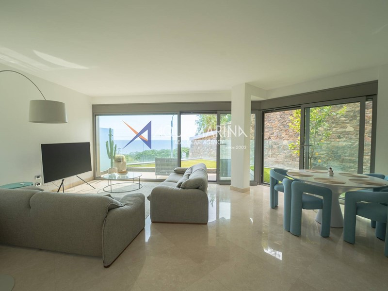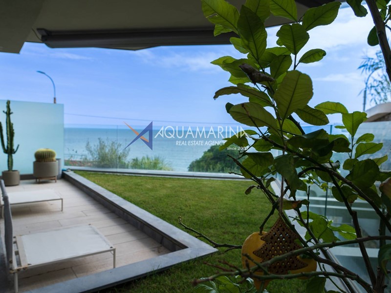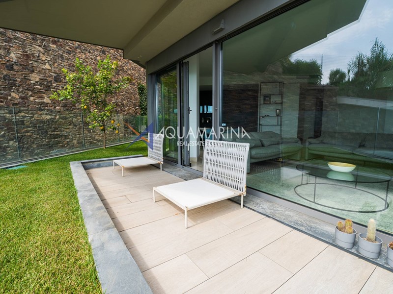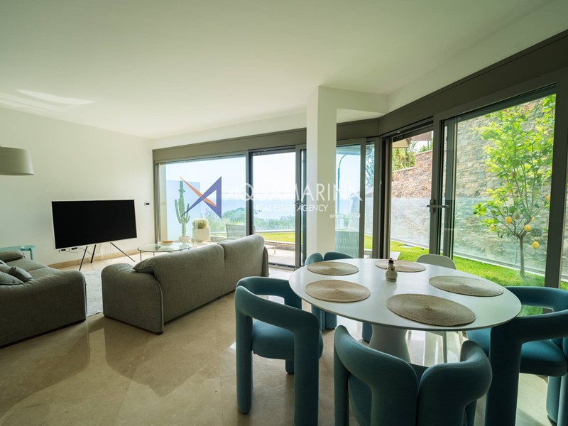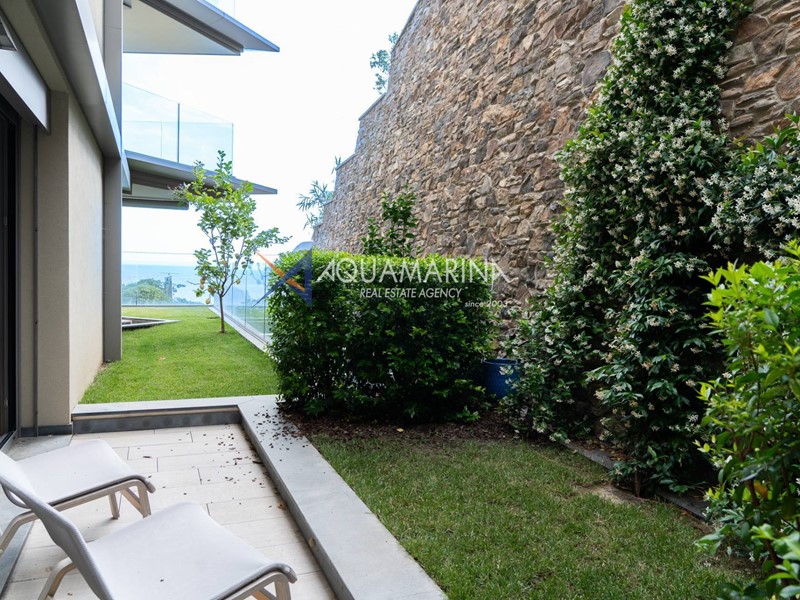 Appartamento di 115 mq. con giardino privato di 62 mq.; è composto da: ingresso, due spaziose camere da letto, due bagni, disimpegno, soggiorno con cucina a vista, terrazzo e giardino con vista mare e città.