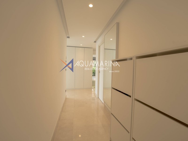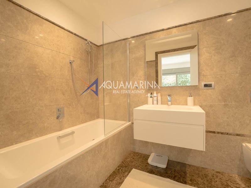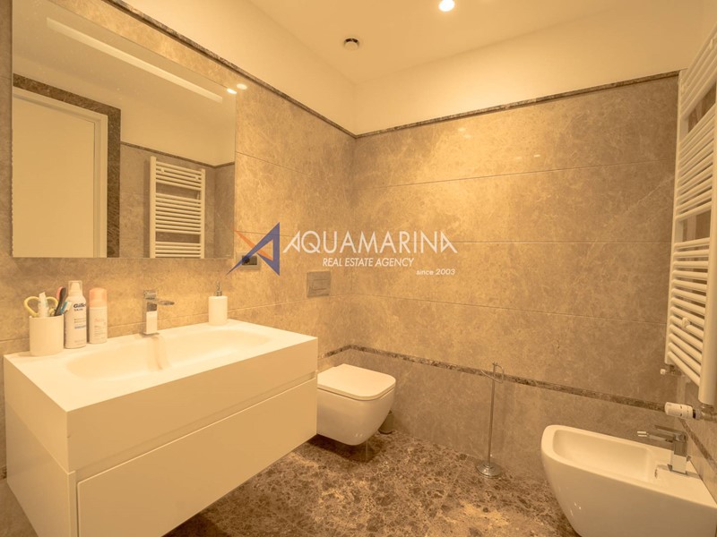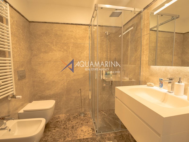 Finiture molto raffinate e di pregio, come marmo crema Marfil nella zona soggiorno, mentre nella zona notte un parquet di rovere bianco. Per i rivestimenti dei bagni è stato utilizzato lEmperador Dark al suolo e un marmo Montecarlo per le pareti.