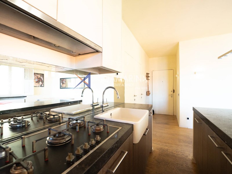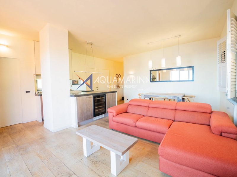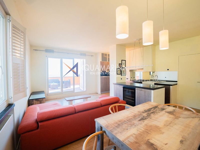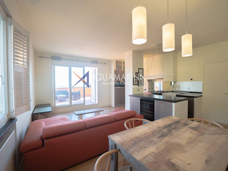 L'appartamento è composto da una spaziosa zona giorno con cucina a vista, ideale per momenti di convivialità e relax, grande terrazzo con vista mare, wc a disposizione della zona giorno.