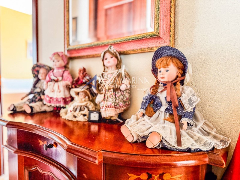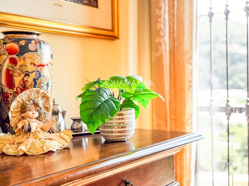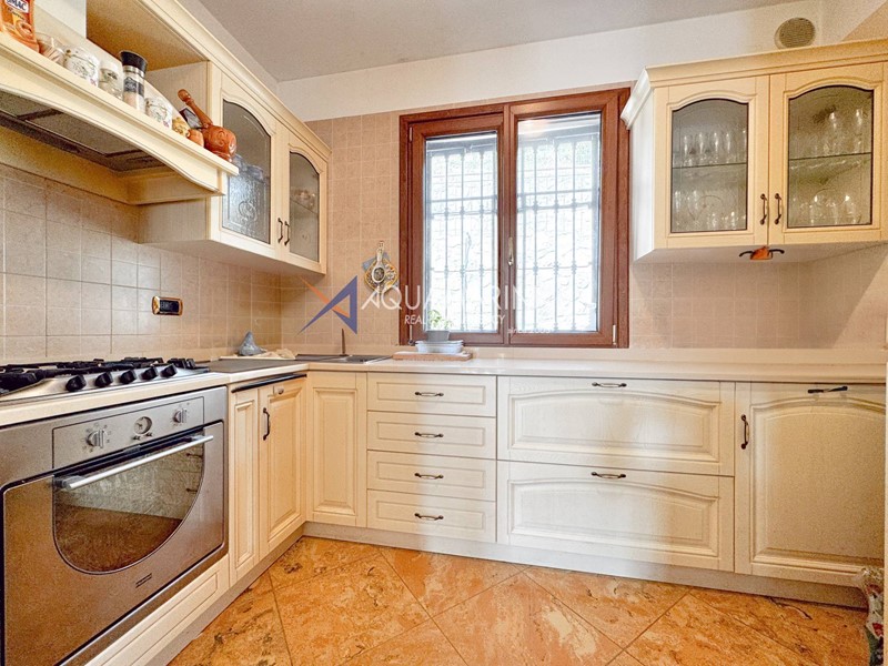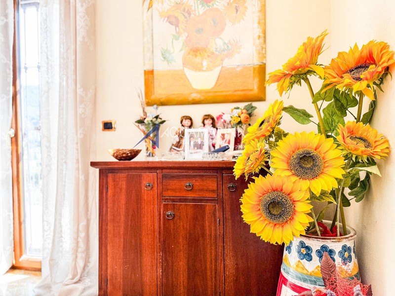 Una scala esterna, circondata da magnifici fiori, ci accompagna al piano terra dove troviamo l'appartamento principale composto da ingresso in salone e zona pranzo, ampia cucina, doppi servizi e due comode camere da letto.