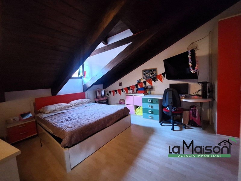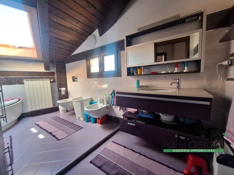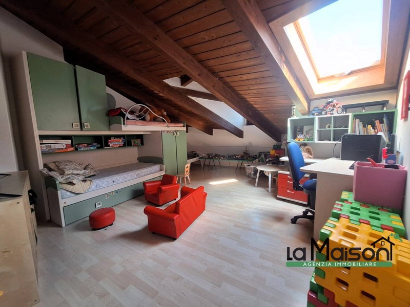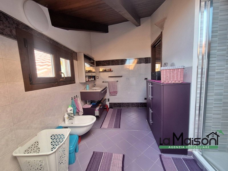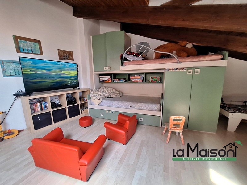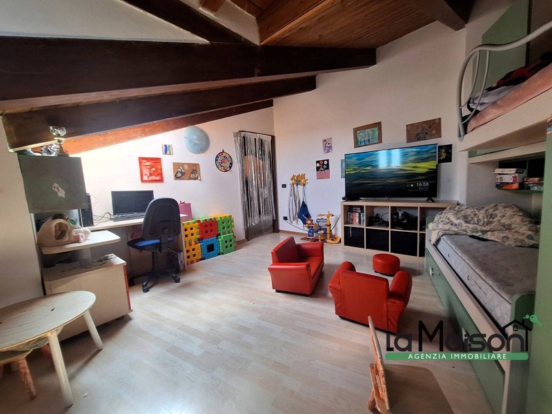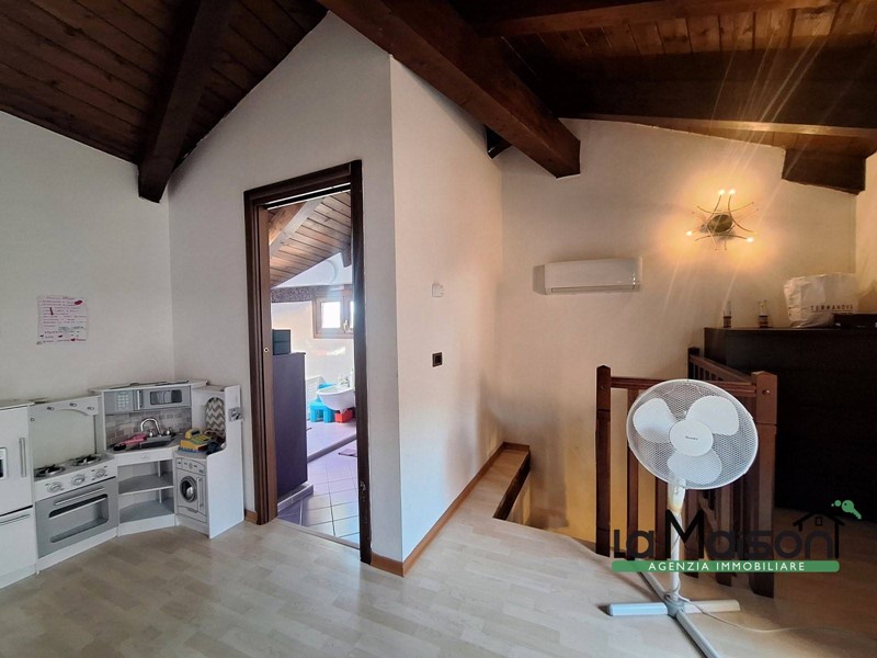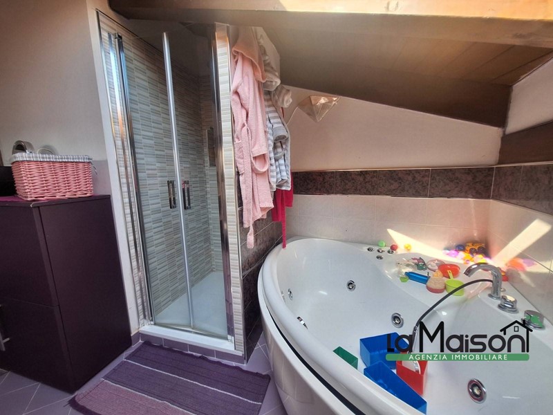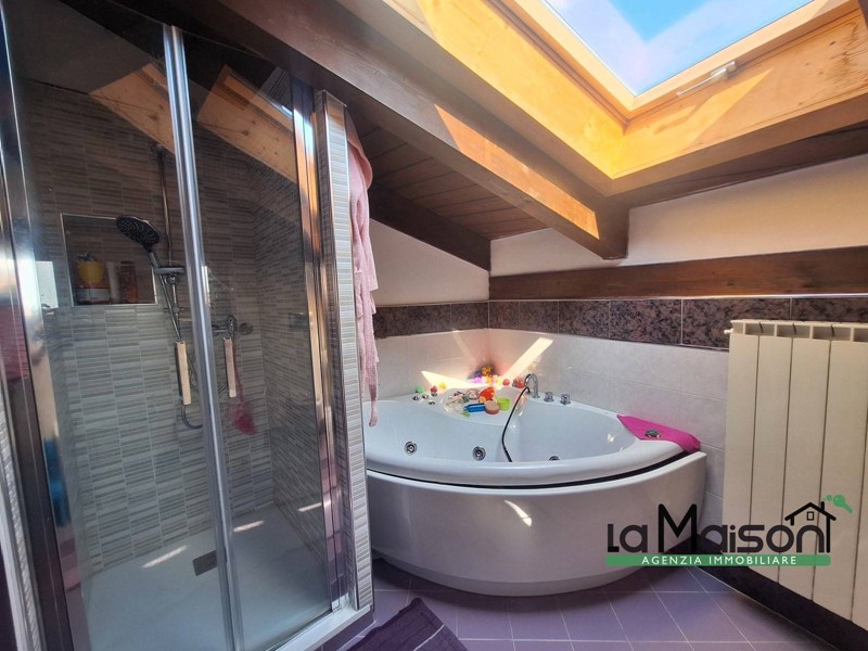 Al secondo piano tramite scala interna in legno, troviamo la zona del sottotetto con il disimpegno tre locali ed il bagno con vasca idromassaggio e doccia.