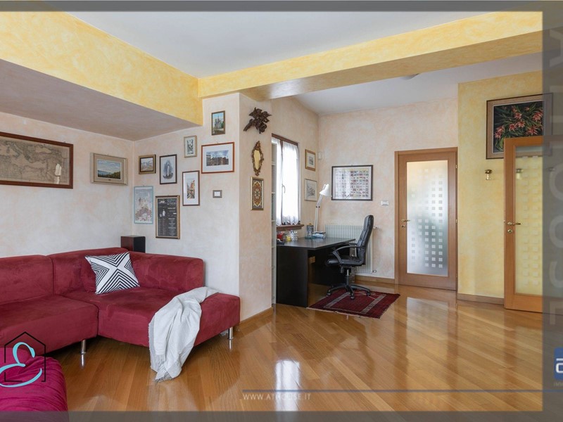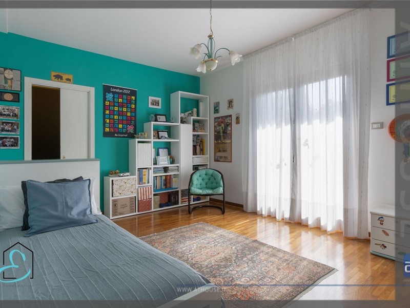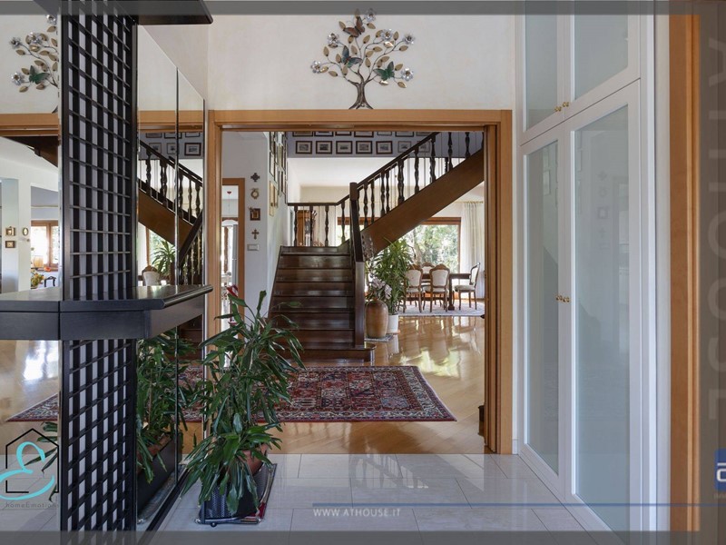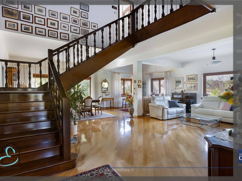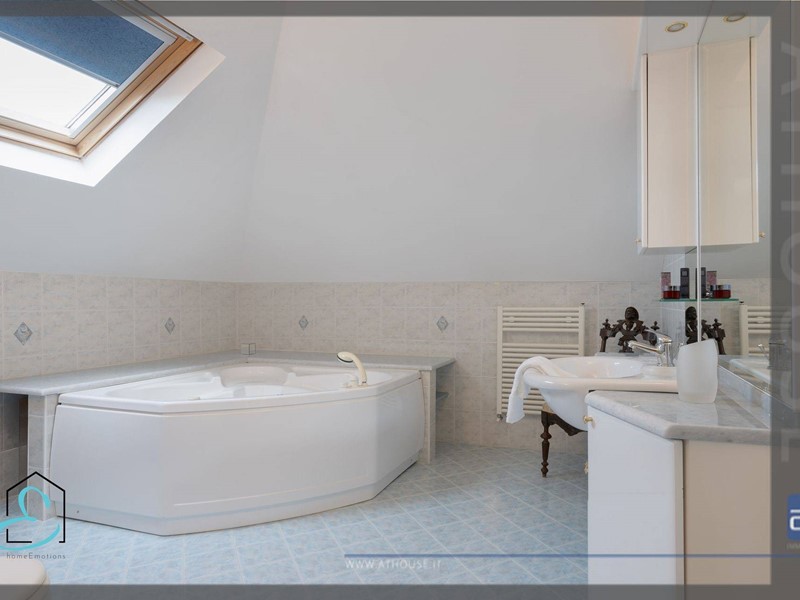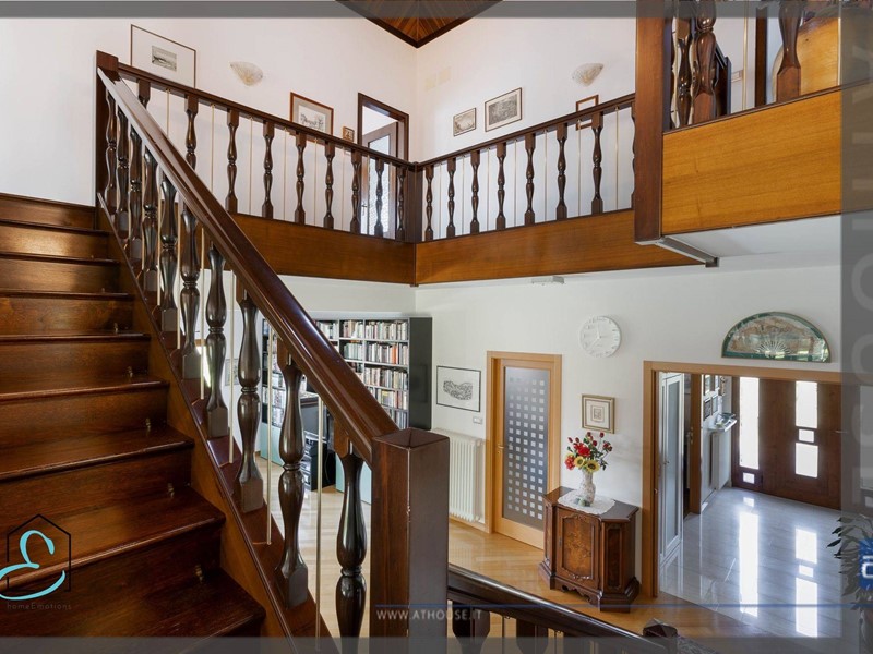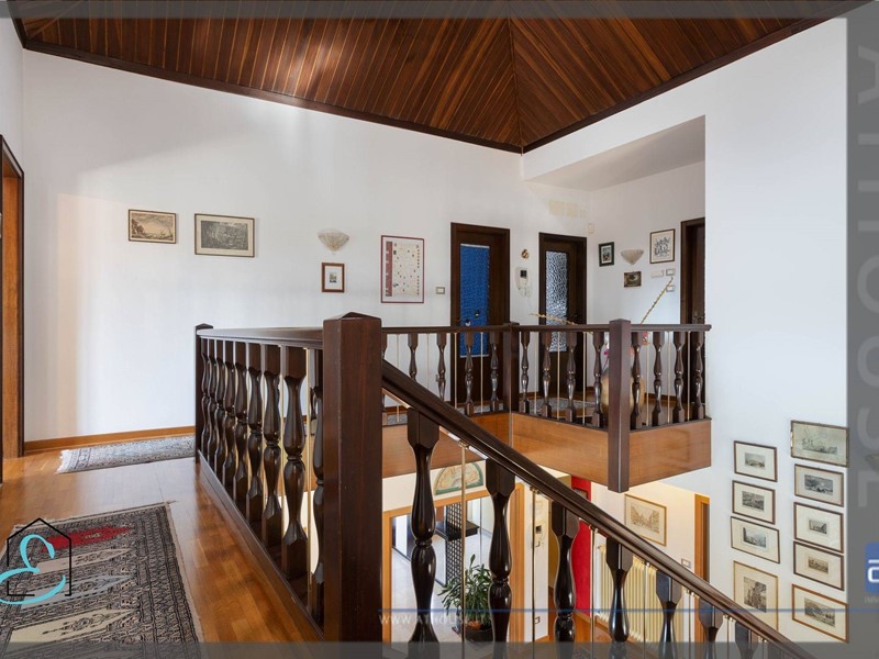 La doppia altezza della zona giorno è valorizzata da una splendida scala in mogano che porta al livello superiore. Questo piano presenta ben quattro camere affacciate sui rispettivi terrazzi, ideali per ospitare una famiglia numerosa o per creare ambienti dedicati a hobby e lavoro. Due delle camere comunicano direttamente con le zone sottotetto attualmente utilizzate come cabina armadio e ripostiglio. La camera padronale comunica invece con un bagno privato completo e finestrato. Infine è presente un terzo bagno completo e finestrato.
